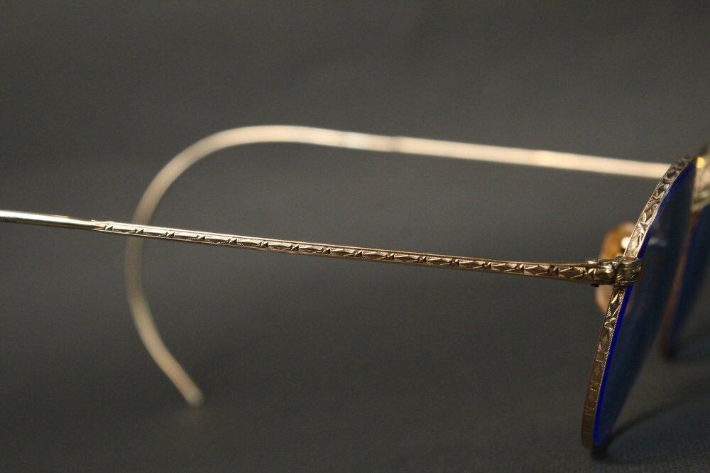 Vintage [Bausch + Lomb] glasses from the late 1930s. Named as one of the three major eyeglass manufacturers in the United States, it is a brand with a history of more than 150 years, but at the end of B & L Ray-Ban, no eyeglasses are made in modern times, and its vintage frame has become a rare one. A full-view Boston round frame with a temple on top, a whole that can only be seen by this age, wielding the spectacle industry, where jewelers who lost their jobs in World War I were in high demand. The delicate engraving on the surface is also attractive. A slightly side-mounted soft round silhouette and a solid frame make it a very valuable large size. It is a 12Kt-Yellow Gold gold-plated specification. We have newly added a light blue UV lens. It has been maintained at the eyeglass store. The size of the wire (nawate) can be adjusted. (At your local optician) We have scrutinized the condition, but since it is a vintage item, there are threads and scratches. Please purchase after understanding the characteristics of vintage and antique.