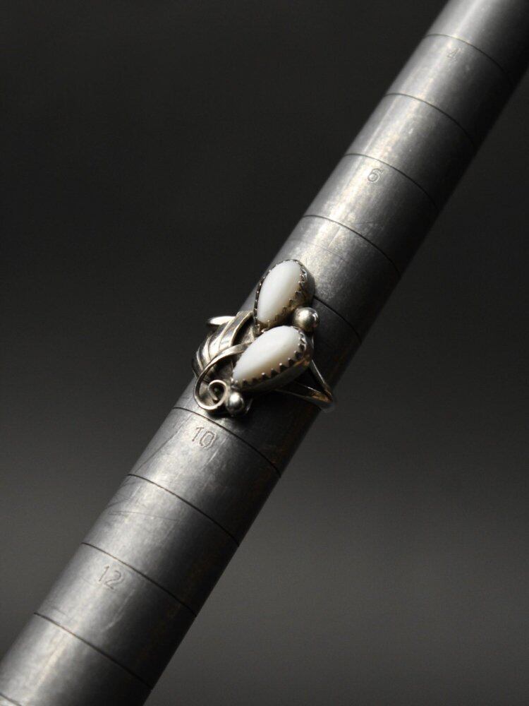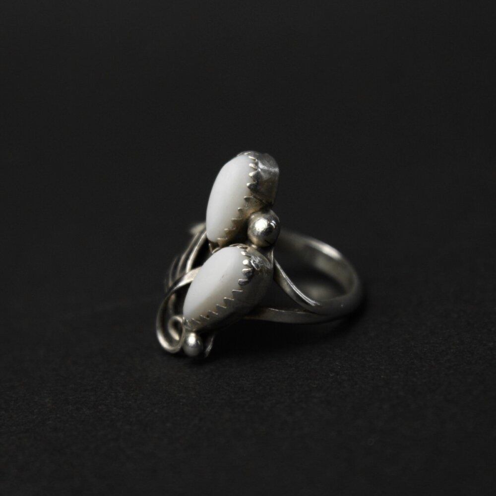 A Navajo ring with a white shell in a tear-and-drop-like top design. The balance between the slender body and the top design creates delicacy, and the wing-like design is also a point. I cant see the engraving, but its sterling silver. Please check the condition in the photo and purchase after acknowledging the characteristics of vinteg.