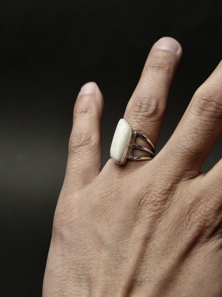 A Navajo ring with marble (quartz) in a vertically long diamond-shaped top design. The three wire silver bodies have a delicate atmosphere, and the topstone has an elegant appearance with glittering inclusions in a natural white color. I cant see the engraving, but its sterling silver. Please check the condition in the photo and purchase after acknowledging the characteristics of vinteg.