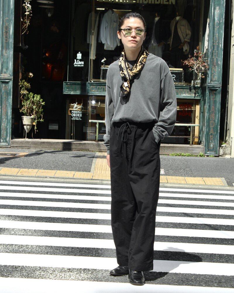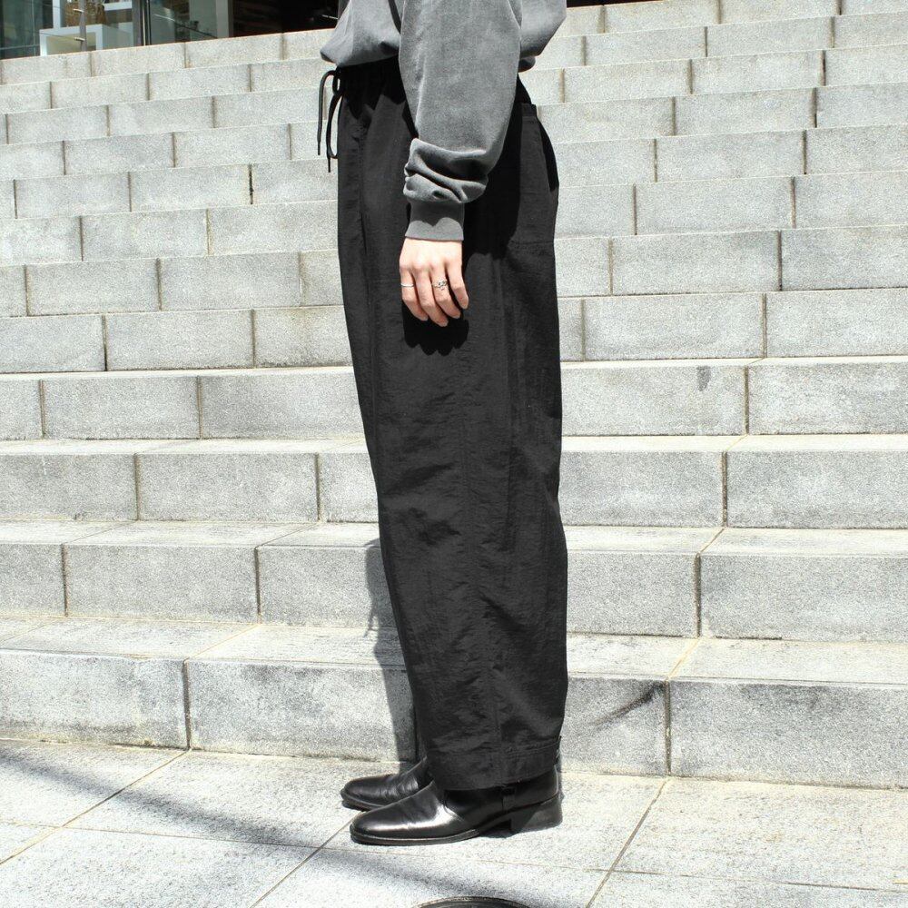 [Roundabout] 2021 S / S Collection Nylon tasser fabric woven with water-repellent threads is used instead of water-repellent processing on the fabric. Because it is a spun-like nylon with a touch like hair growth using a special thread, it is a synthetic fiber material but has a natural texture like a natural material. The big balloon silhouette, which is our specialty, is an easy pants specification, and the strap at the hem makes it possible to squeeze more and adjust the silhouette.