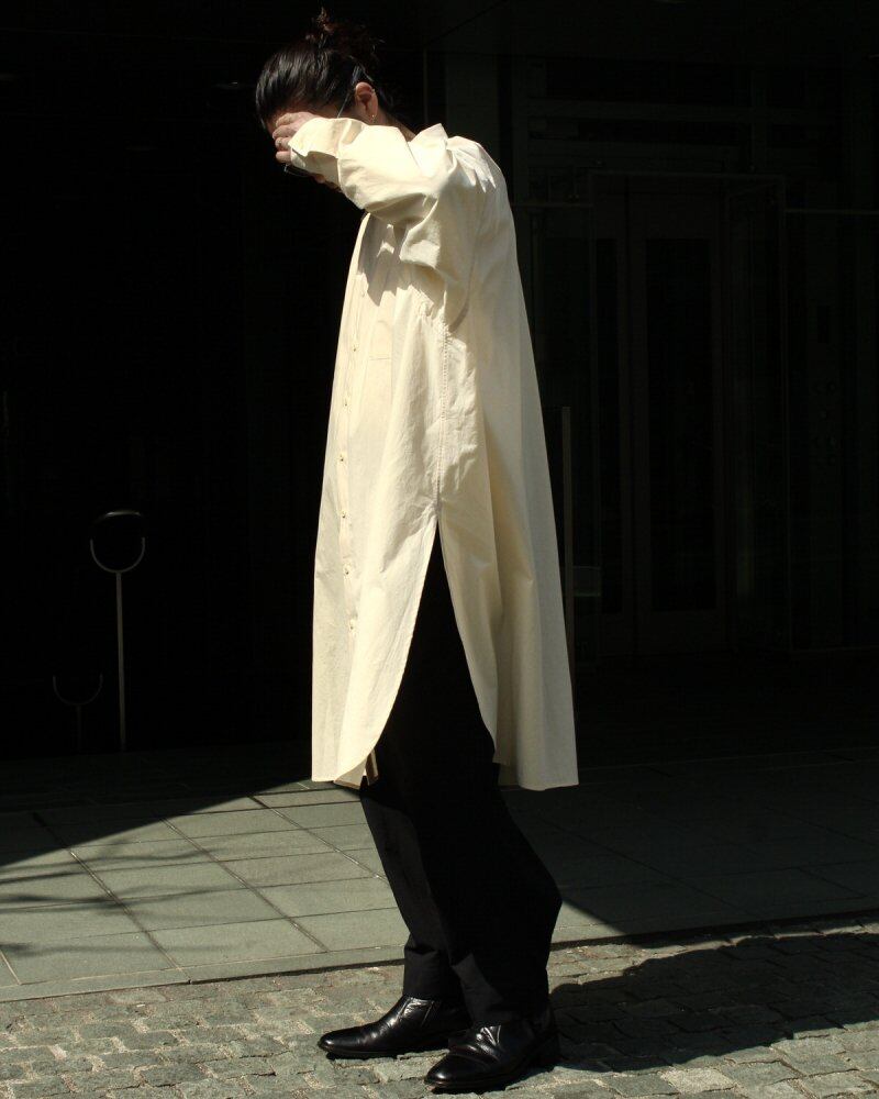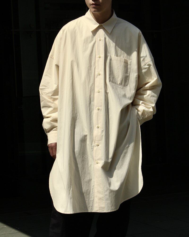 [Roundabout] 2021 S / S Collection The typewriter fabric of Mexican Pima, which is an ultra-long cotton that is considered to be as high-class as Supima cotton, is used. Special washer processing is applied and wrinkles and rubbing may occur, but you can enjoy the unique natural texture as it is. The idea is based on the 8XL size big shirt of American used clothing worn by our staff, and it is characterized by its lightness and movement due to the deep slits that can be worn more neatly. We made a beige fabric in our shop and made it in ecru color (cream beige), which has a more natural texture. In addition, we have added another size to the size that is being developed aiming for a bigger silhouette and made a bespoke order.