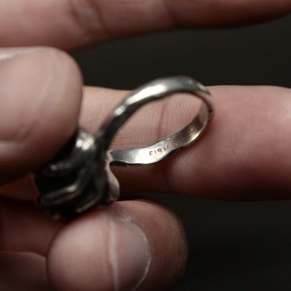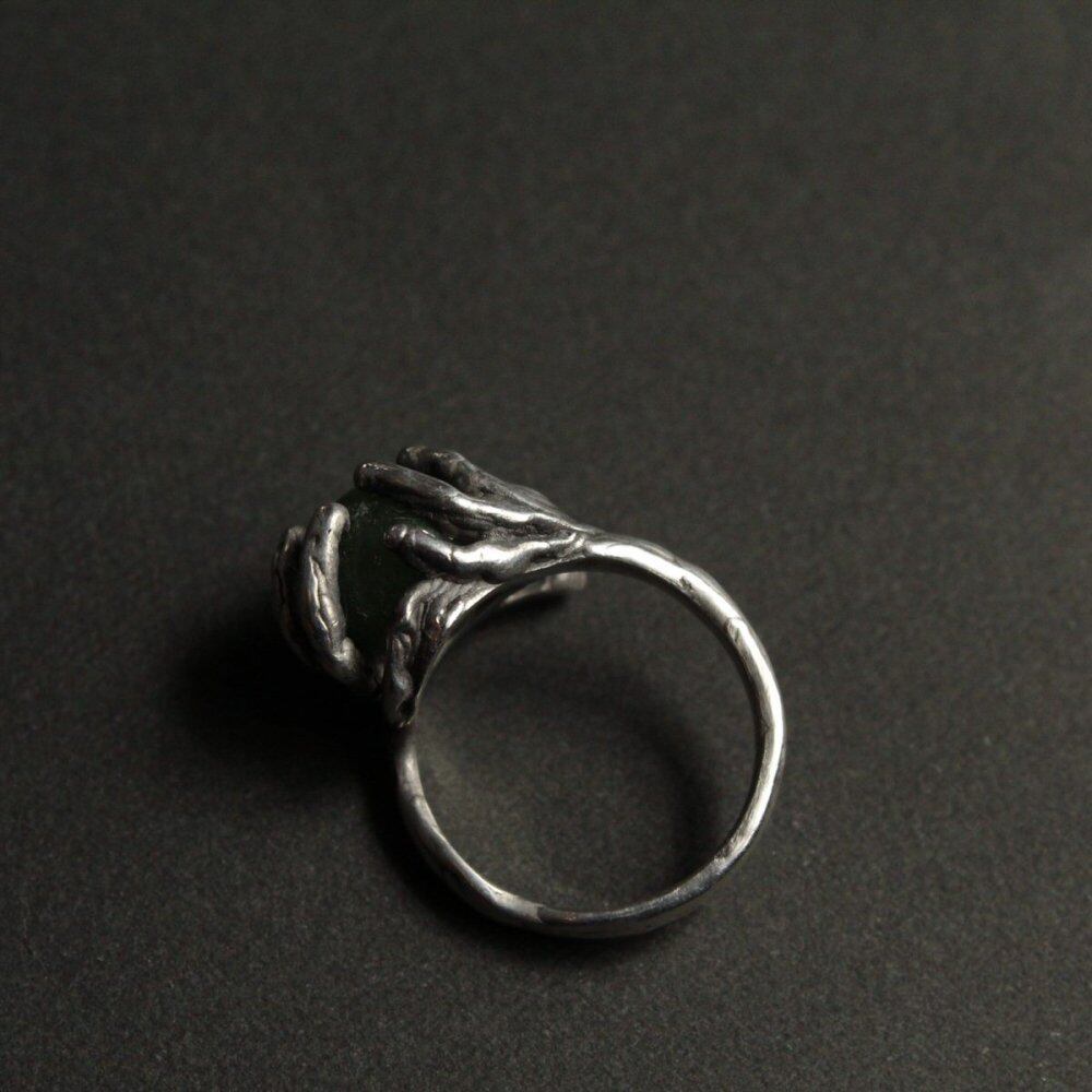 A stone ring with probably Aventurine on the top. The design of the fingers is given so as to grab it, and it is a design reminiscent of a legendary dragon. Aventurine is a gemstone that is said to have a relaxing effect and features a deep green. It is an individual with the softness unique to handmade. The engraving has disappeared, but it is sterling silver. Please check the condition in the photo and purchase after acknowledging the characteristics of vinteg.