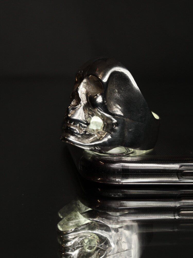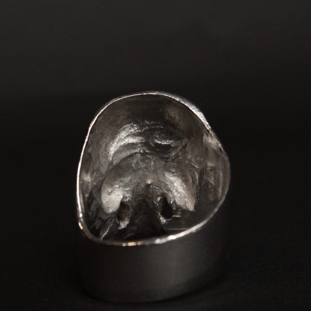A very large skull motif ring. The ring size is also large, but the design has a profound feeling that is hard to see and a realistic depiction, making it more mannish. It is an item that makes you feel biker style and counter culture and gives off a presence as a room ornament due to its size. I cant see the engraving, but its sterling silver. Please check the condition in the photo and purchase after understanding the characteristics of vintage.