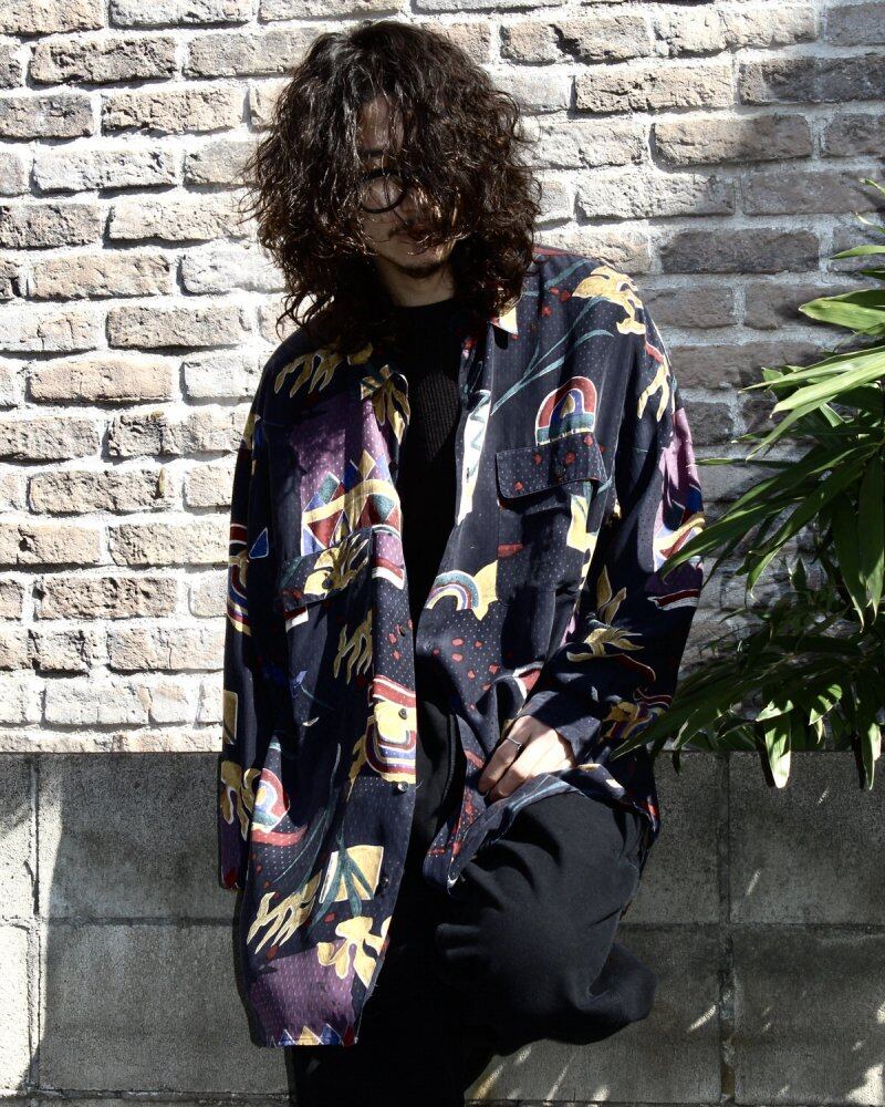 It is a silk shirt of GOOUCH around the 1990s. Alan Goouch, who was active as a photographer, immigrated from London in the 1960s and started in Canada. A brand with many art prints inspired by traveling around the world, it has a better sense than other brands and makes the fabric feel high quality. A high-quality fabric with a unique drape that is light and smooth using 100% silk fabric. The dark navy body has a woven dot pattern and an African ethnic pattern, giving it a psychedelic appearance that is typical of this brand. XL size with a relaxed silhouette. Valuable old stock, overall in good condition subjectively. Since it is an old product, it rarely deteriorates over time. Please check the photo and purchase after acknowledging the characteristics of vintage.