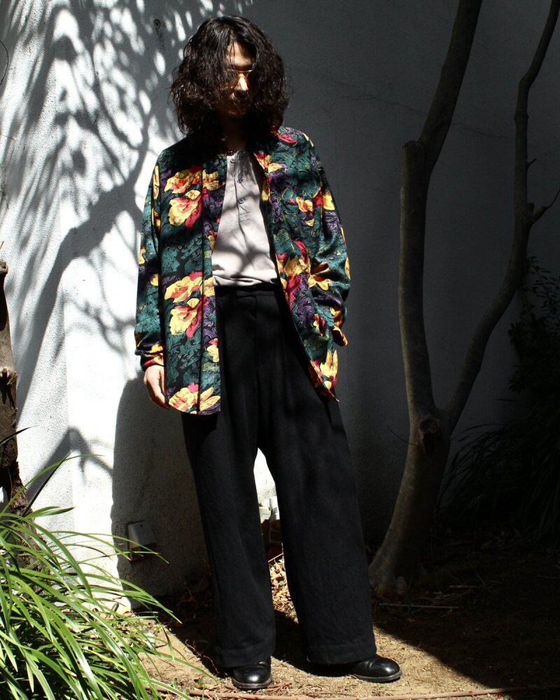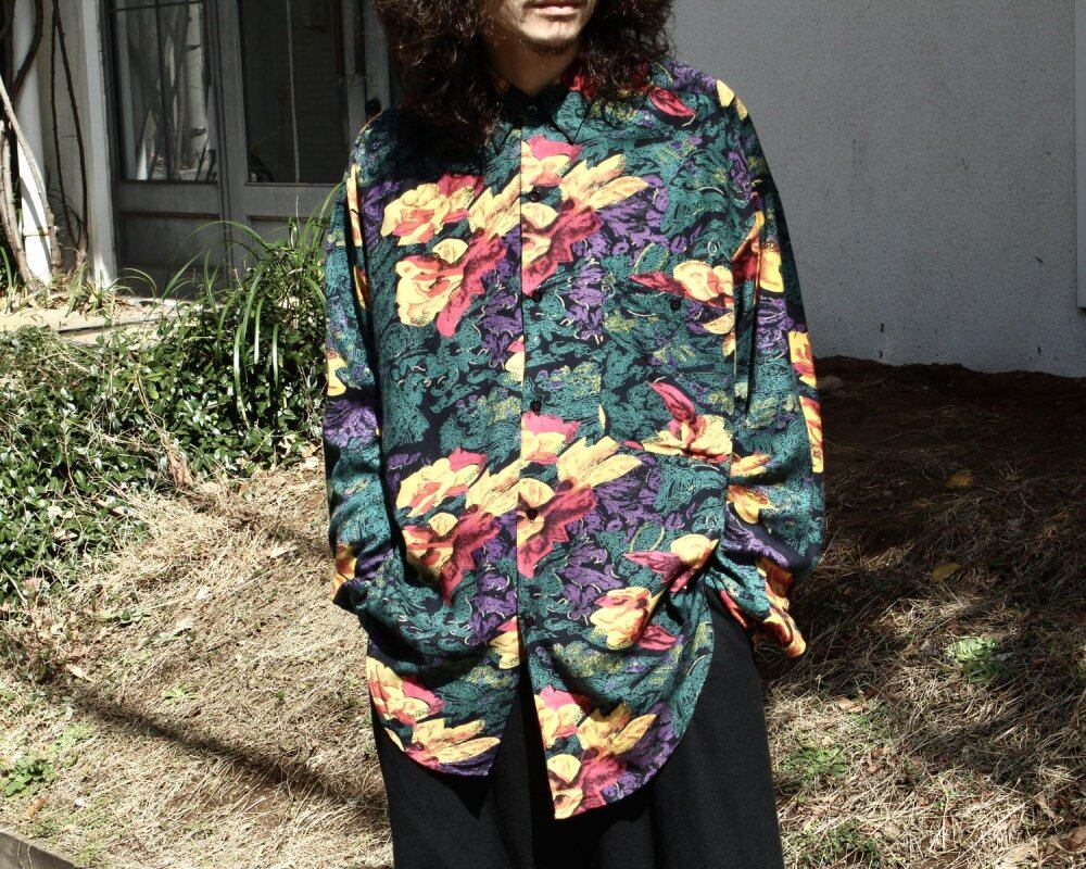 It is a rayon shirt of GOOUCH around the 1990s. Alan Goouch, who was active as a photographer, immigrated from London in the 1960s and started in Canada. A brand with many art prints inspired by traveling around the world, it has a better sense than other brands and makes the fabric feel high quality. Made from 100% rayon, it has a soft texture and a unique drape. A flower pattern that shines on a black base, and psychedelic artwork that is typical of this brand. XL size with a relaxed silhouette. It is in good condition subjectively. Since it is an old product, it rarely deteriorates over time. Please check the photo and purchase after acknowledging the characteristics of vintage.