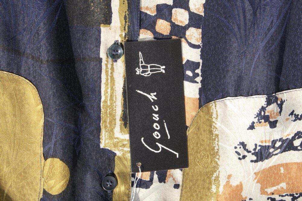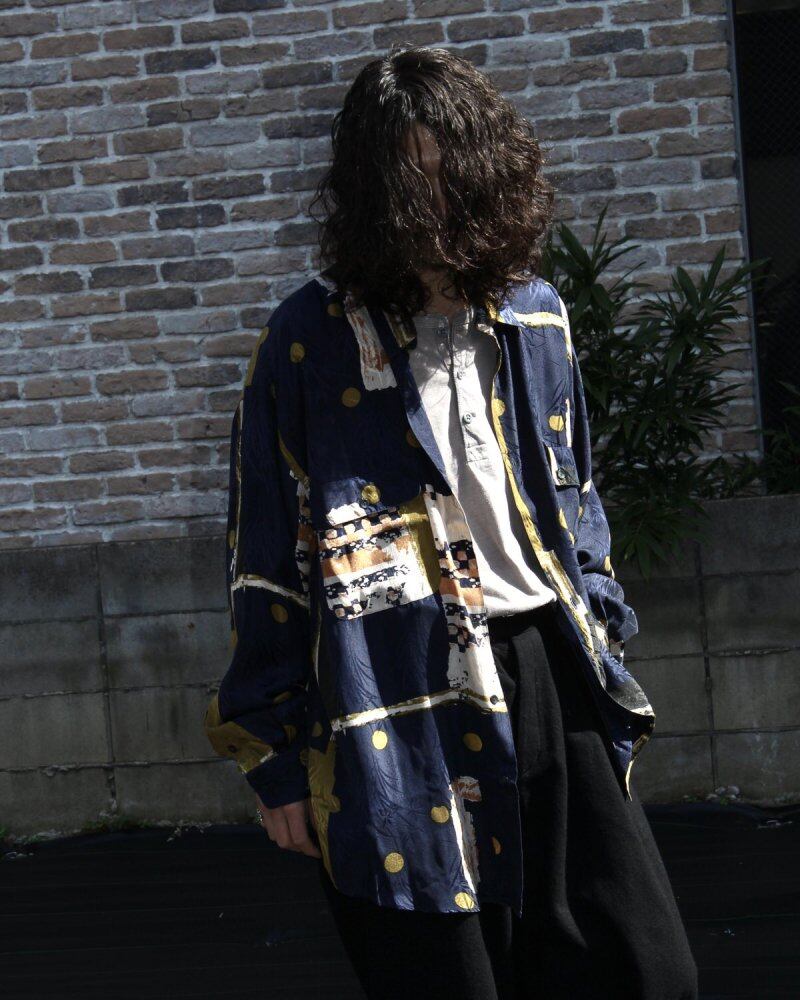 It is a silk shirt of GOOUCH around the 1990s. Alan Goouch, who was active as a photographer, immigrated from London in the 1960s and started in Canada. A brand with many art prints inspired by traveling around the world, it has a better sense than other brands and makes the fabric feel high quality. A high-quality fabric with a unique drape that is light and smooth using 100% silk fabric. Elegant artwork with a unique floating feeling of gold dot pattern on the body with a Japanese-style fine woven pattern based on dark navy. XL size with a relaxed silhouette. Valuable old stock, overall in good condition subjectively. Since it is an old product, it rarely deteriorates over time. Please check the photo and purchase after acknowledging the characteristics of vintage.