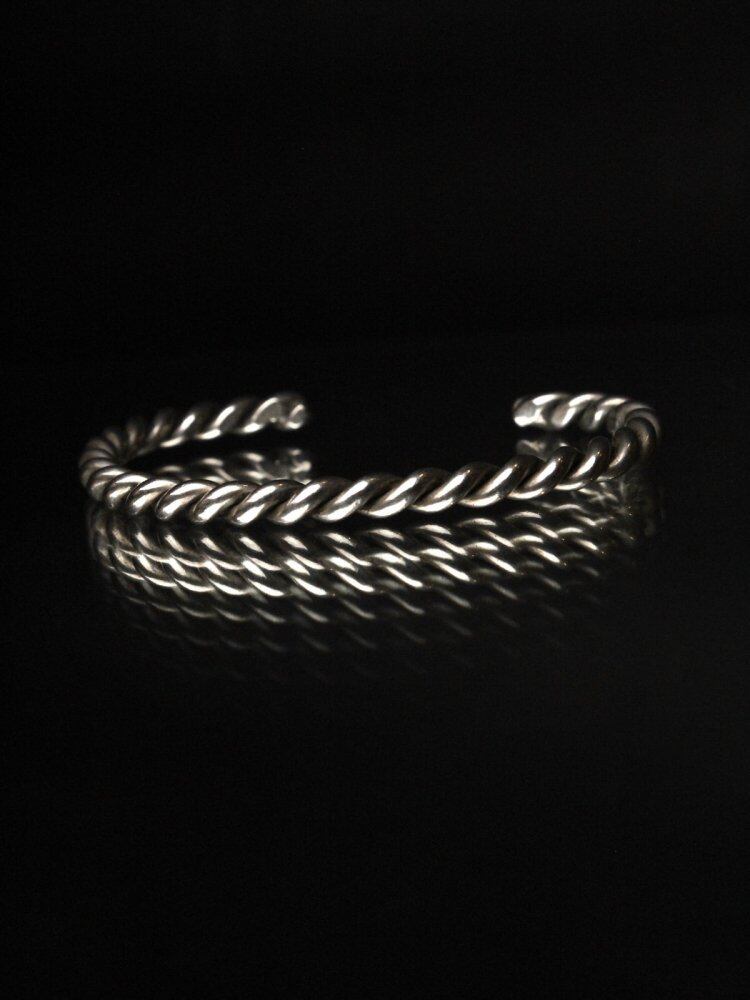A vintage Navajo bangle. The precious narrow silhouette gives off a simple yet profound atmosphere, and the spiral design of wire silver shows a mannish and delicate look. I cant see the hallmark, but its sterling silver. Since it is old, it may be scratched. Please check the photo and understand the characteristics of vintage before purchasing.