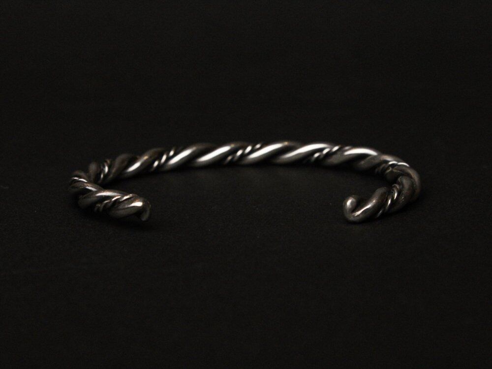 A vintage Navajo bangle. The precious narrow silhouette gives off a simple yet profound atmosphere, and the spiral design of wire silver shows a mannish and delicate look. I cant see the hallmark, but its sterling silver. Since it is old, it may be scratched. Please check the photo and understand the characteristics of vintage before purchasing.