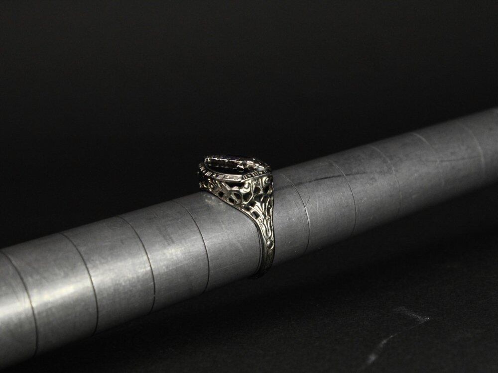 A masonic ring from the 1920s. Founded in 1919 by Freemasonry for younger men and women with more spiritual power, named after the last Grandmaster of the Knights Templar, Jacques de Molay. A delicate Art Deco openwork from the slender body to the top, and onyx on the small top, a sword motif imitating the Knights Templars cross pattée. Demoray is symbolized by a cross with a star (ruby) representing the nine founders and a crown mark, but this is organized in a very simple design with a central seal and nine diamond-shaped engravings around it. Is impressive. Demorays vintage ring is a rare item. It is an elegant white gold engraved with 14kt Gold. Please check the condition in the photo and purchase after acknowledging the characteristics of vinteg.