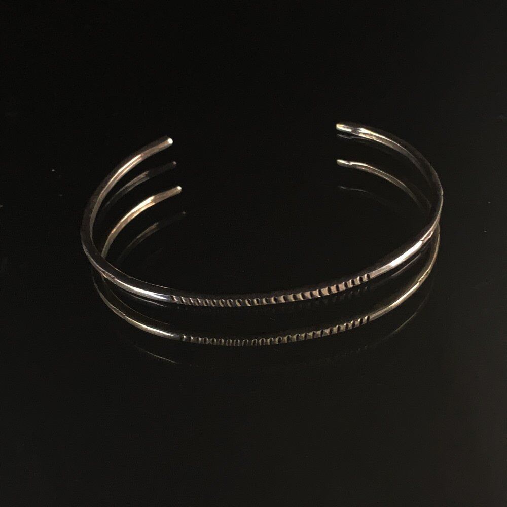 Square silver bangle by Navajo female artist ERICKA NICOLAS BEGAY. All of her works use handmade ingot silver, giving off a presence that sets it apart from modern machine-produced Navajo jewelry, and because the plate making is also particular about handmade, there is no one that is the same. Each one is unique and unique. Inspired by the Fred Harvey style that has been around since the 1800s, her work is different from the heavy and profound Navajo jewelery, with a delicate and delicate atmosphere and a stylish yet handmade texture. This square type has a narrow silhouette and a delicate atmosphere with horns. The delicate stamp work unique to women is delicate, and the stamps of authentic Navajo jewelry such as rain, arrow, and star are gently felt. There is no dullness due to oils and chemicals that are common in machine production, and the elegant and beautiful shine unique to handmade, the careful finish feels the delicacy unique to women, and it is a mannish and delicate expression that can be recommended for women as well as layering. We try to make the product photos as close to the actual colors as possible, but the colors may differ from the actual products depending on your monitor settings, room lighting, etc.