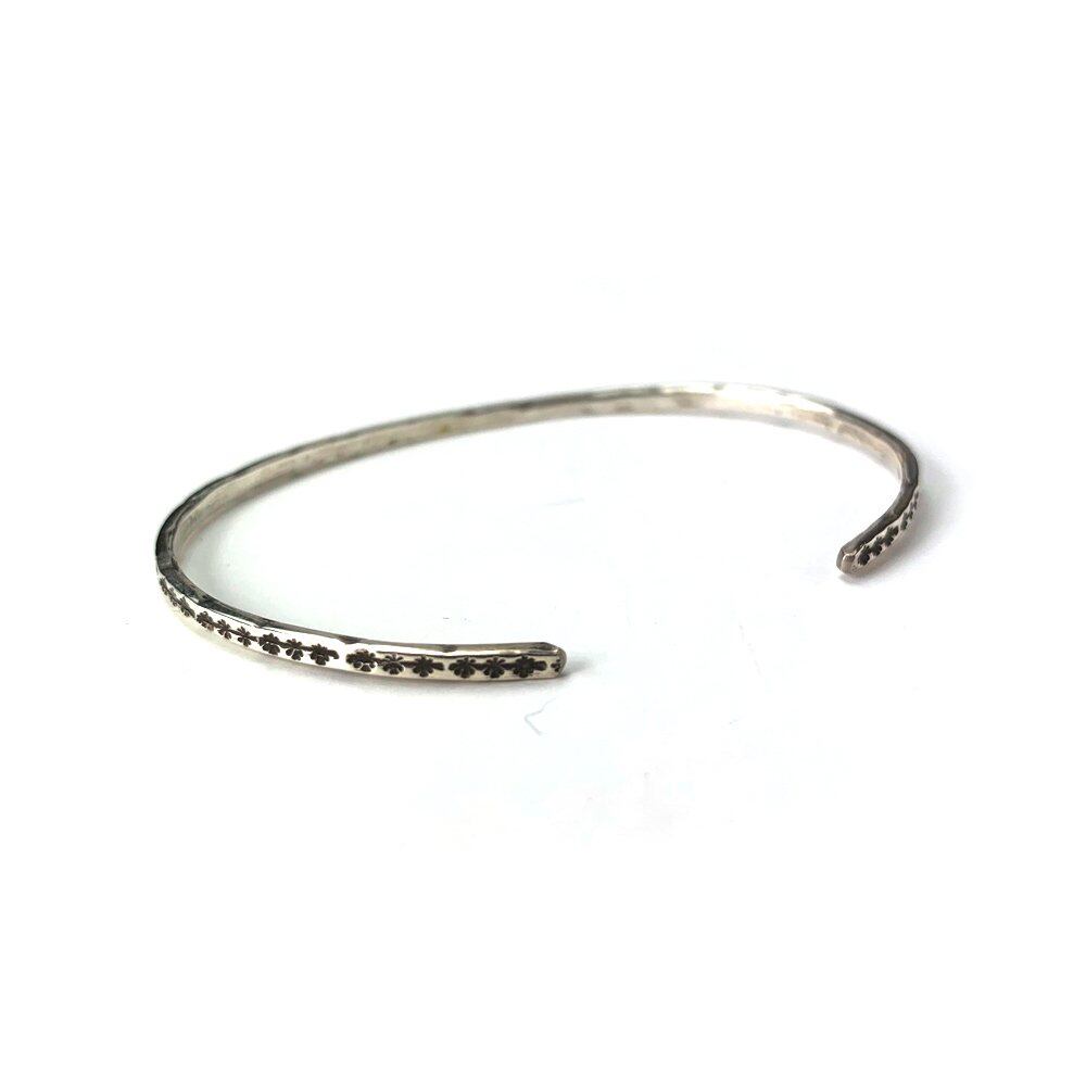 Square silver bangle by Navajo female artist ERICKA NICOLAS BEGAY. All of her works use handmade ingot silver, giving off a presence that sets it apart from modern machine-produced Navajo jewelry, and because the plate making is also particular about handmade, there is no one that is the same. Each one is unique and unique. Inspired by the Fred Harvey style that has been around since the 1800s, her work is different from the heavy and profound Navajo jewelery, with a delicate and delicate atmosphere and a stylish yet handmade texture. This square type has a narrow silhouette and a delicate atmosphere with horns. The delicate stamp work unique to women is delicate, and Stardusts authentic Navajo jewelry stamps feel gentle. There is no dullness due to oils and chemicals that are common in machine production, and the elegant and beautiful shine unique to handmade, the careful finish feels the delicacy unique to women, and it is a mannish and delicate expression that can be recommended for women as well as layering. We try to make the product photos as close to the actual colors as possible, but the colors may differ from the actual products depending on your monitor settings, room lighting, etc.