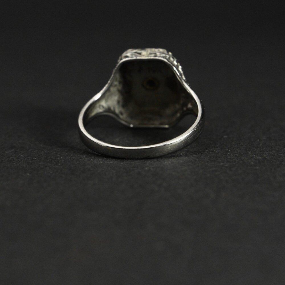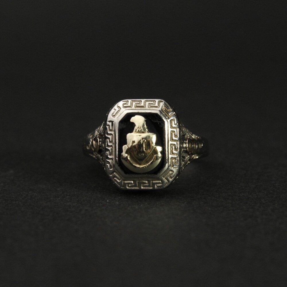A 1928 vintage class ring. Considering this age, the design is like a masonic ring, which is extremely rare in college rings, and the rare white gold body, delicate Art Deco style engraving, and the oriental style auspicious crest that was popular at that time are also interesting and luxurious. Onyx stops, emblems and age numbers are yellow gold. 14kt gold engraving. The upper part of the onyx is slightly chipped, so please check the condition with the photo and purchase it after acknowledging the characteristics of vinteg.