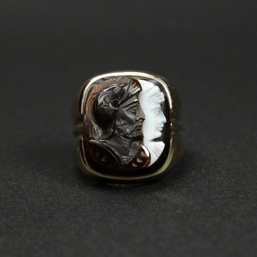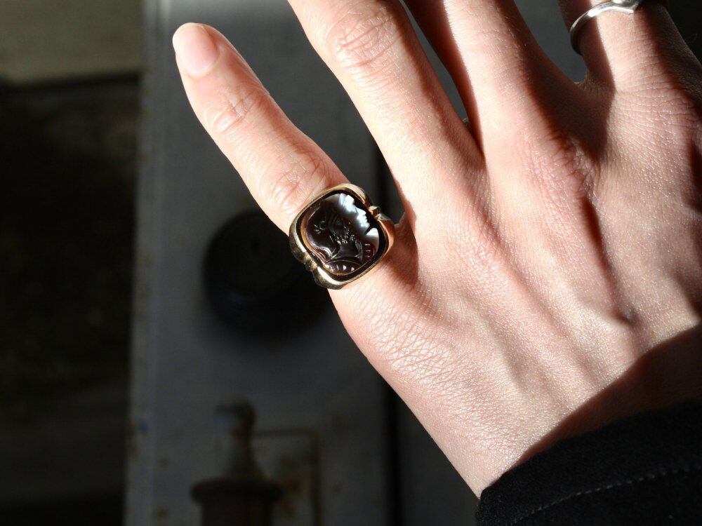 The precious mens cameo ring, the knight and probably the Virgin, is dug, and the design is seemingly different from the image of a feminine cameo coming and going. Our Lady is a shell, and the knight and the body are probably garnets, giving a classical impression. The large body and cameo top make it look dignified. From the design point of view, it seems to be an individual from the 1940s. Probably resized and not engraved, but probably 10kt gold. Please check the condition in the photo and purchase after understanding the characteristics of vintage.