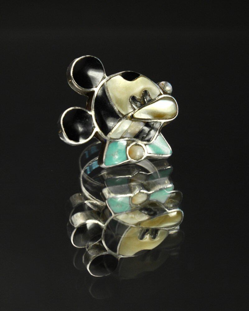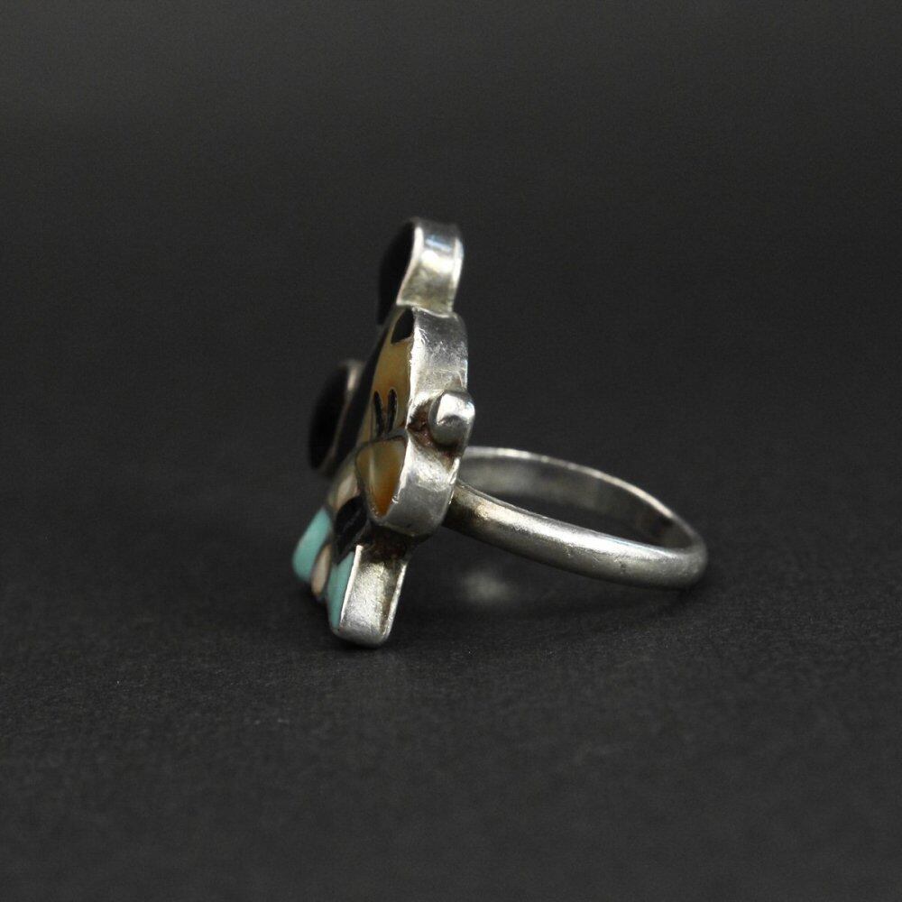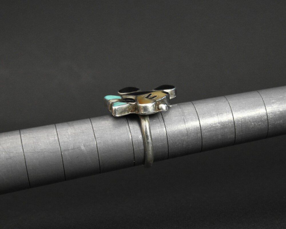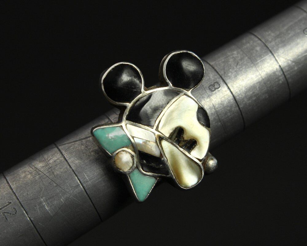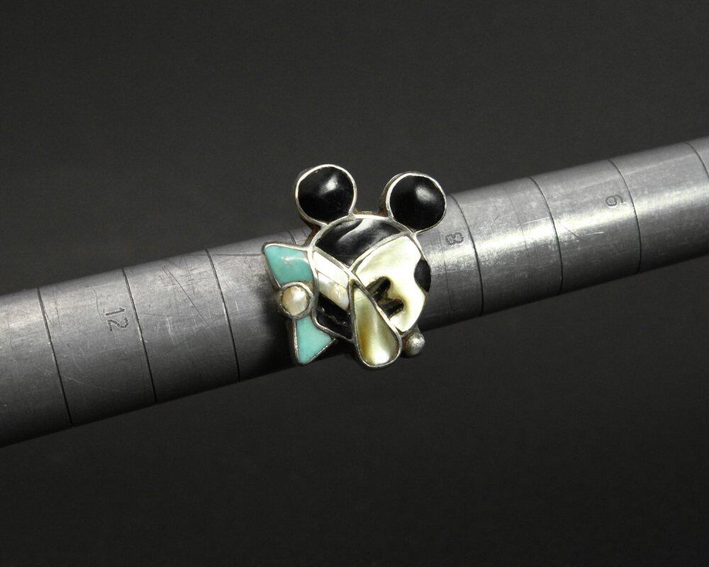 A Zuni ring that specializes in inlay work in Navajo. The precious design of the deformed Mickey Mouse is a gem unique to the Zuni people, with shells, onyx, and turquoise set in a solid body. The kitsch appearance and the elegance of natural stone make it a charming vintage. The engraving has disappeared, but it is sterling silver. Please check the condition in the photo and purchase after understanding the characteristics of vintage.