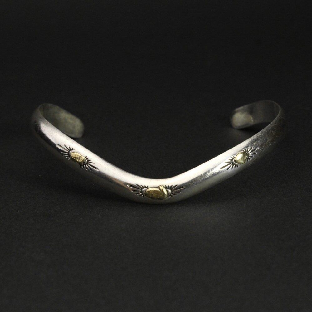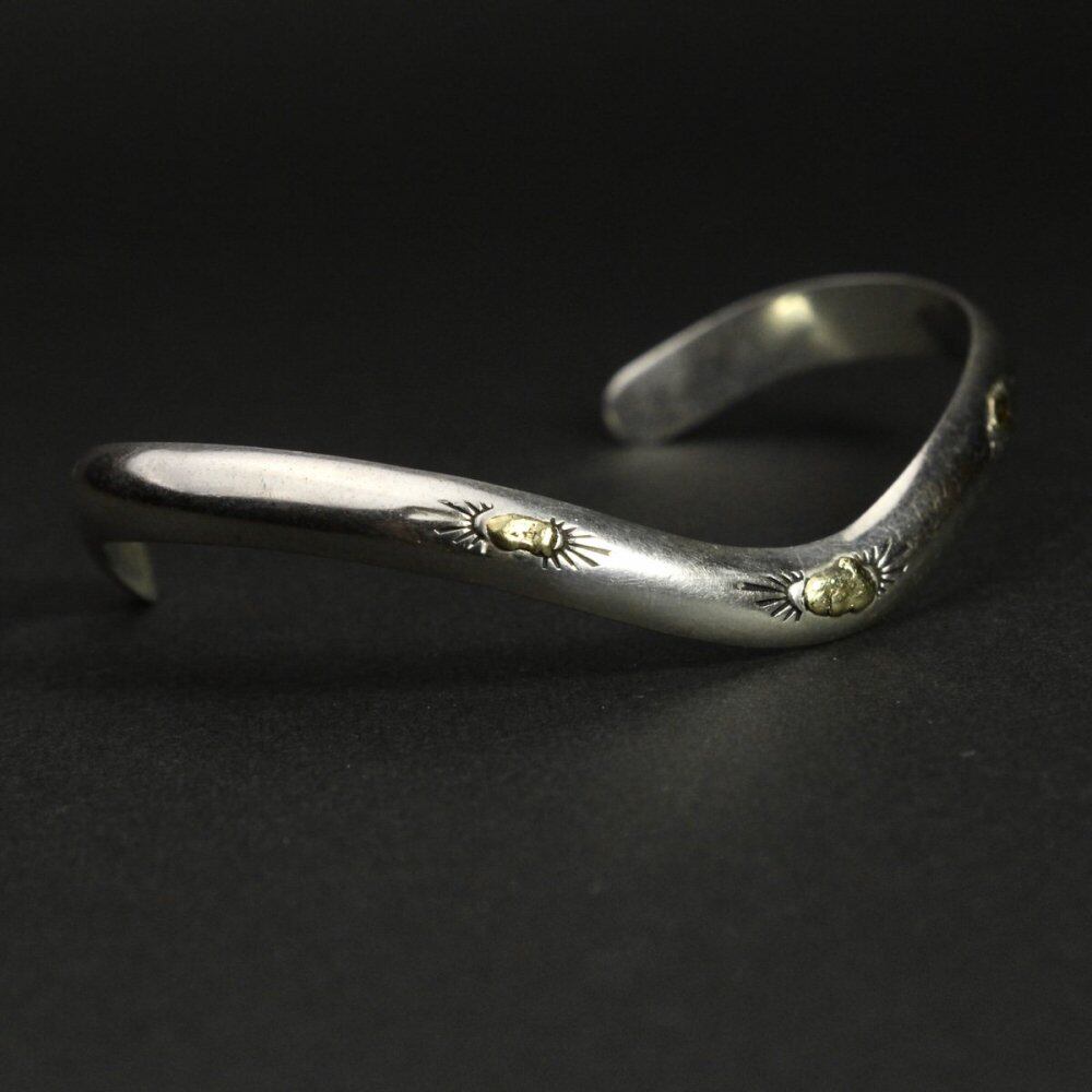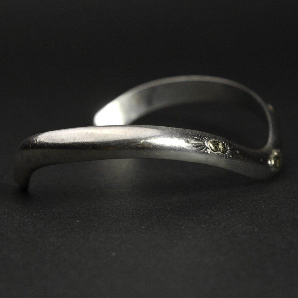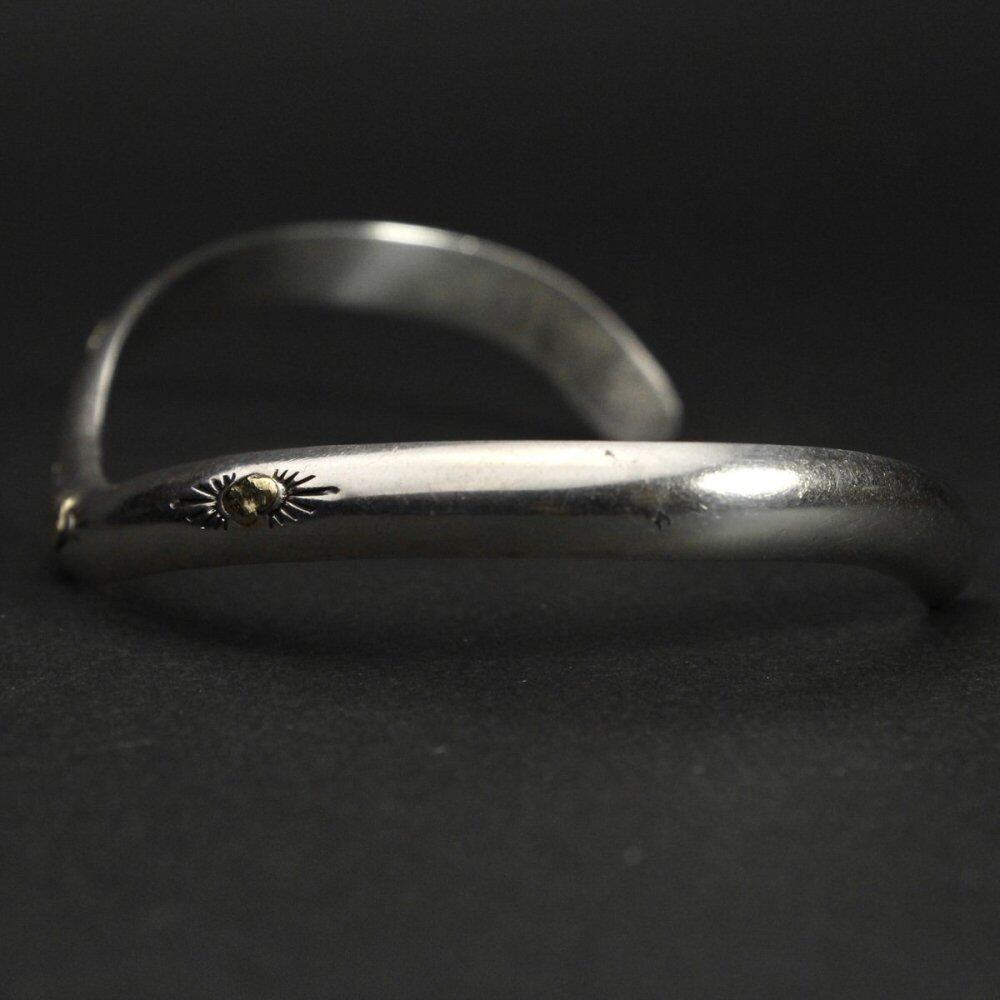 A vintage Navajo bangle. A beautiful silhouette along the wrist with a characteristic waved form. Its probably a cloud design, but it has a simple yet elegant appearance with gold (14kt?) Inlaid. It is 925 engraved sterling silver. Since it is old, it may be scratched. Please check the photo and understand the characteristics of vintage before purchasing.