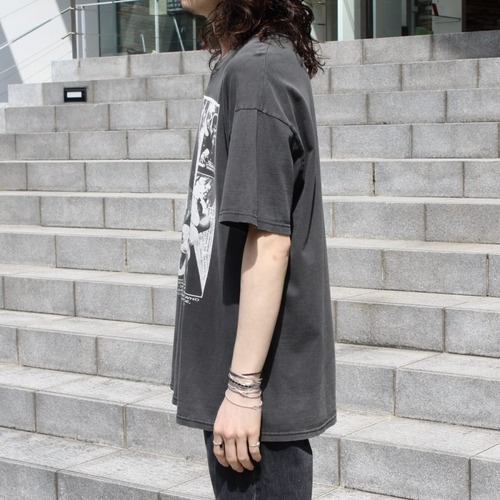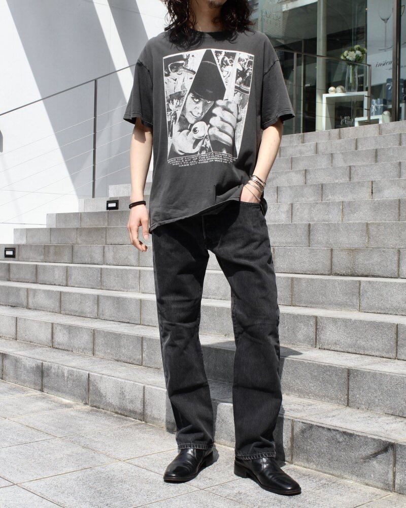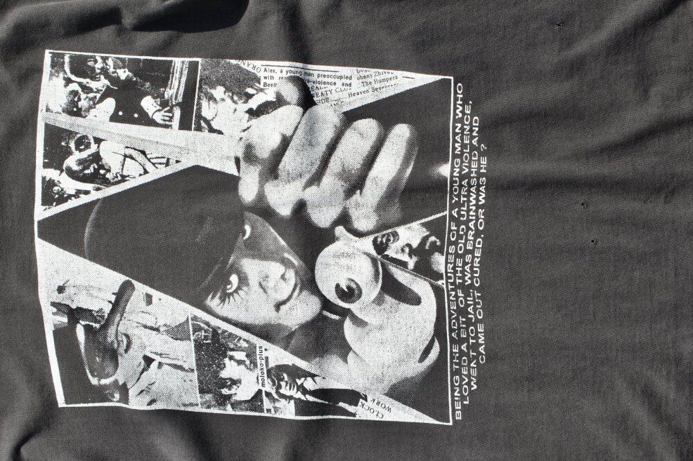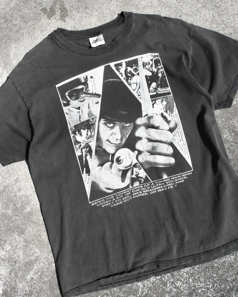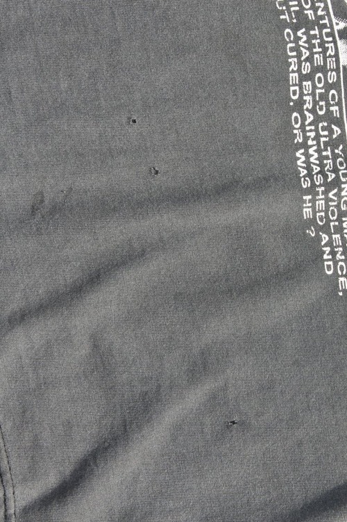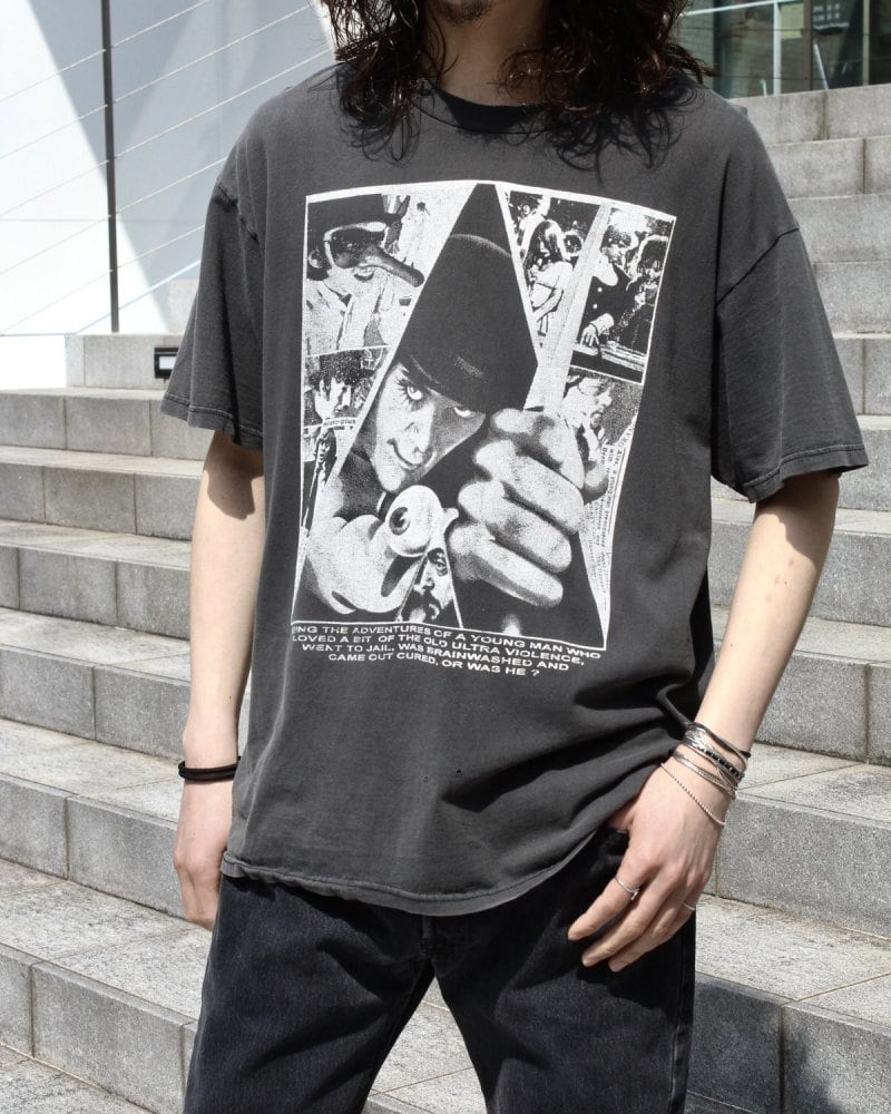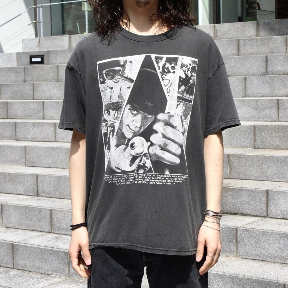 A Clockwork Orange is a 1971 film directed by Stanley Kubrick, based on the novel of the same name published by Anthony Burgess in 1962. The movie is popular as a cult, but even though T-shirts were printed in musicals in the 90s, the number of balls is small and it is a rare item in the market. The color is a black body, L size and a loose silhouette. There are no small holes in several places and no other major damage. Since it is an old product, it rarely deteriorates over time. Please check the photo and understand the characteristics of Vintage before purchasing.