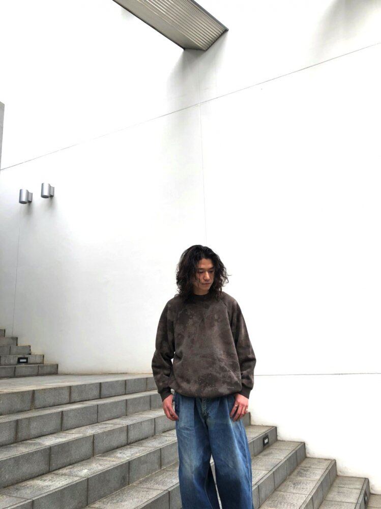 A mottled charcoal color that looks like a camouflage due to the vintage sweatshirt bleaching of the 90s. A good size and silhouette with just the right amount of room.