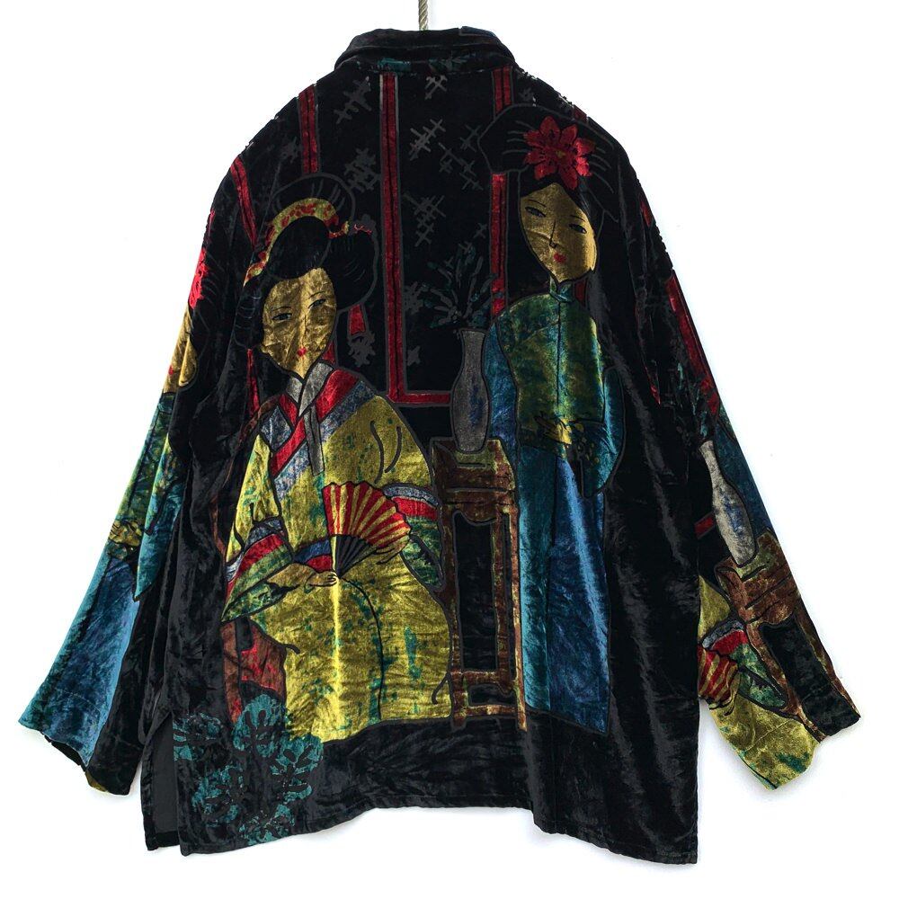 A velvet shirt with a powerful art pattern on a glossy velvet fabric. A playful design with a large female drawing and a watermark on the whole. The velvet fabric, which is a combination of silk and rayon, is soft and has a feeling of falling, and it has a beautiful drape feeling that falls down smoothly. It is a size that makes the drape feel more attractive even if you put it on with a moderately spacious silhouette. Quality: Rayon 80% Silk 20% Color: Black Red Blue Green 【size】 Shoulder width: 48 cm Width: 63 cm Sleeve length: 58 cm Length: 72cm [Model size] Height: 175 cm Shoulder width: 43 cm B (chest circumference): 85 cm W (waist): 71 cm