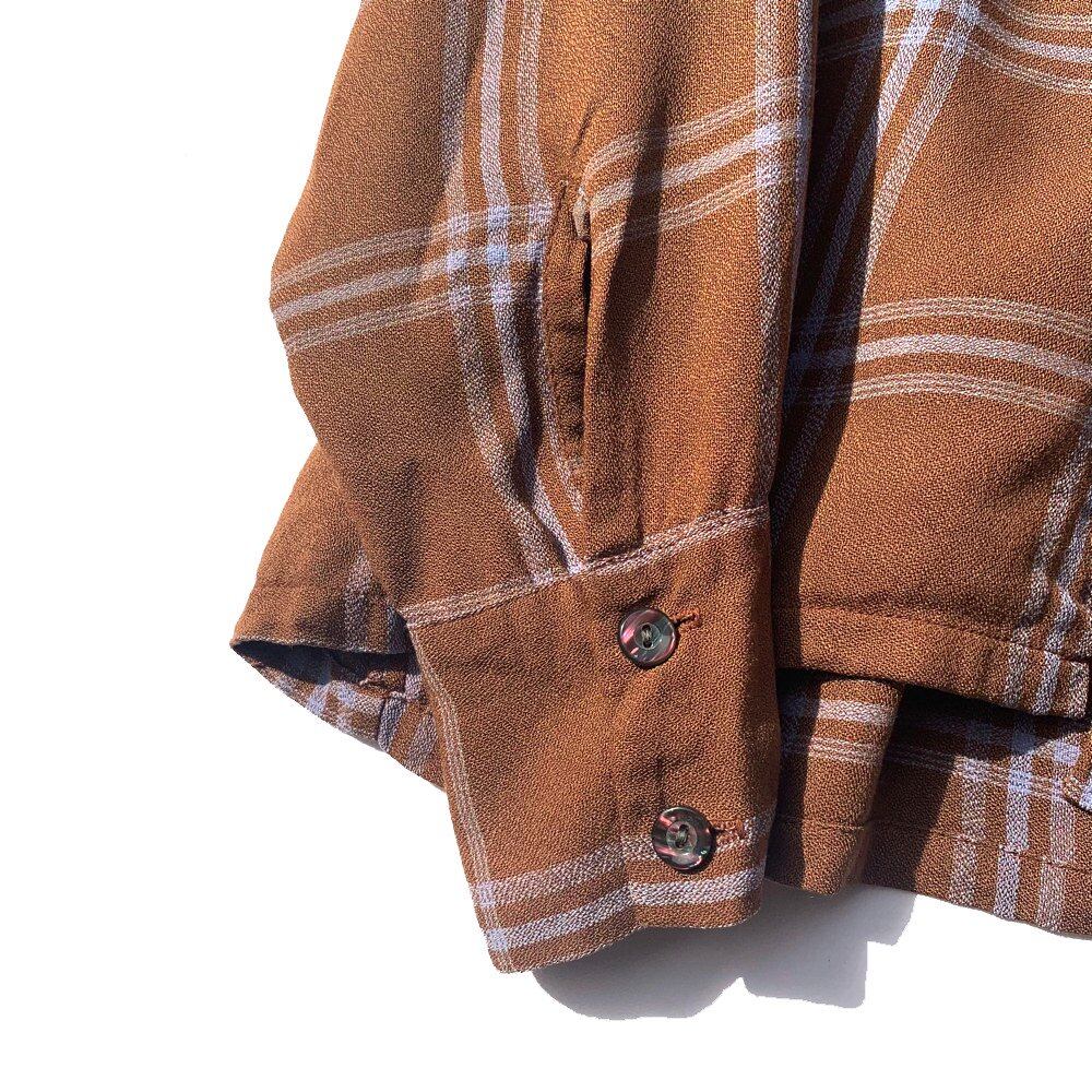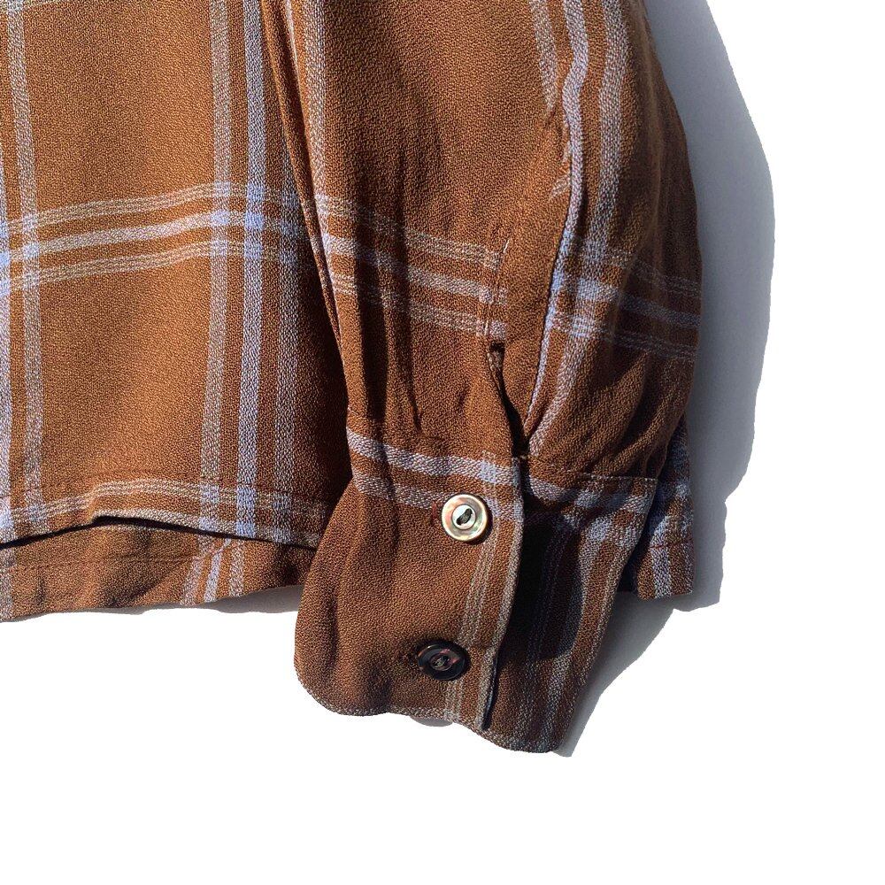 Around the 1960s, this is an open collar shirt. The crepe rayon fabric is used for its soft and light texture, giving it an elegant appearance. The smooth drape and soft and comfortable texture are attractive. The calm brown-based coloring also feels calm, and while the sax blue check pattern is refreshing, it is a gem that you can see the mannishness peculiar to the age and the rudy atmosphere. It is a feeling of size with a relaxed feeling of M size notation. Quality: Rayon 60% Acetate 40% Color: Brown 【size】 Shoulder width: 45,5 cm Width: 59 cm Sleeve length: 63 cm Length: 70cm [Model size] Height: 175 cm Shoulder width: 43 cm B (chest circumference): 85 cm W (waist): 71 cm