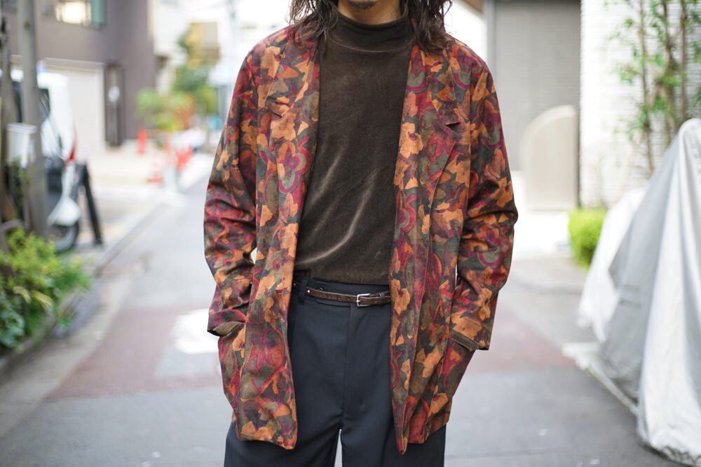 A light jacket from the 1980s that features an elegant and elegant floral pattern while having an impact. The peach skin fabric with an elegant texture that is resistant to dirt and has a soft and matte luster is adopted by fluffing and pruning ultra-fine polyester fibers, and the delicate brown color gives an elegant look. It is a design that shows the elegance of the shape itself while being casual and light. The ethnic leaf prints of this age are put together in the same tone to give a calm impression. It is a relaxed silhouette with soft lines along the body and no shoulder pads, while retaining the mannish of the box silhouette of the time. Quality: Polyester Color: Brown 【size】 Shoulder width: 44 cm Width: 57cm Sleeve length: 58cm Length: 75cm [Model size] Height: 175 cm Shoulder width: 43 cm B (chest circumference): 85 cm W (waist): 71 cm