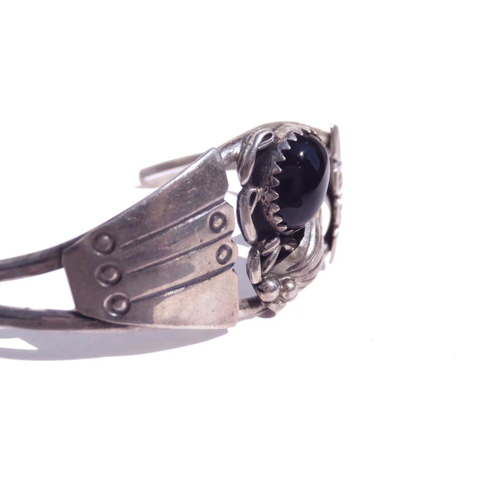 It is a vintage bangle around the 1970s. The contrast between the solid silver and the stone, which is probably onyx, is a departure from the beautiful decoration. It is engraved with STERLING and the artist name jjonaunnr. It is in good condition subjectively, but the atmosphere is attractive, so please understand the characteristics of vintage before purchasing. MATERIAL silver Length (including opening): 153mm Opening: 31mm Width (maximum value): 20mm