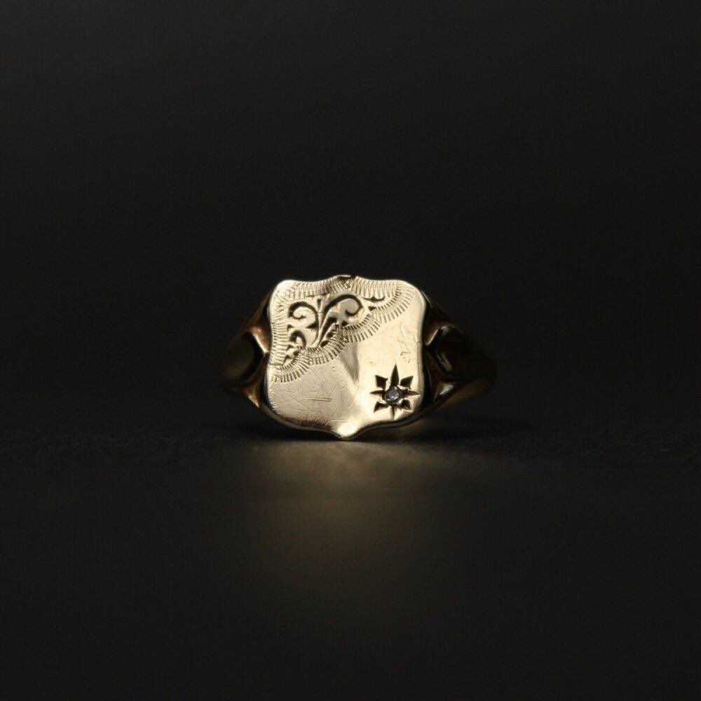 Probably a British-made signet ring around the 1960s. It is the only ring that is allowed to be worn among British gentlemen who wear good things that can be used for a long time with as little waste as possible. This is a vertical top with an arabesque pattern and a simple structure with no initials, and a small diamond with a casual and elegant appearance. It represents 375 engravings and 9 carats of gold according to British standards. The hallmark of the crown representing gold, the sponsor mark of ML, and the hallmark of the age have disappeared. There is some distortion on the top, but I think it brings out a more Vintage feel. Please check the condition in the photo and purchase after acknowledging the characteristics of vinteg. Size: No. 12.5 Head part (vertical): 11mm