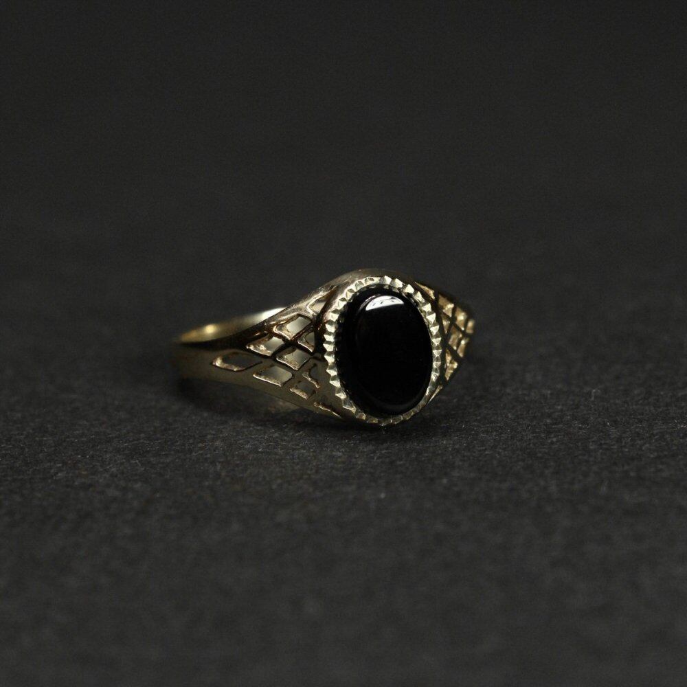 Signet ring made in England. It is the only ring that is allowed to be worn among British gentlemen who wear good things that can be used for a long time with as little waste as possible. A very simple design with an elegant openwork body and onyx stop. It is a designless solid ring that is hard to find when you look for it. 375-9ct gold engraved, Sheffield office hallmark, made in England. Please check the condition in the photo and purchase after acknowledging the characteristics of vinteg. Size: No. 16 head part (vertical): 9 mm