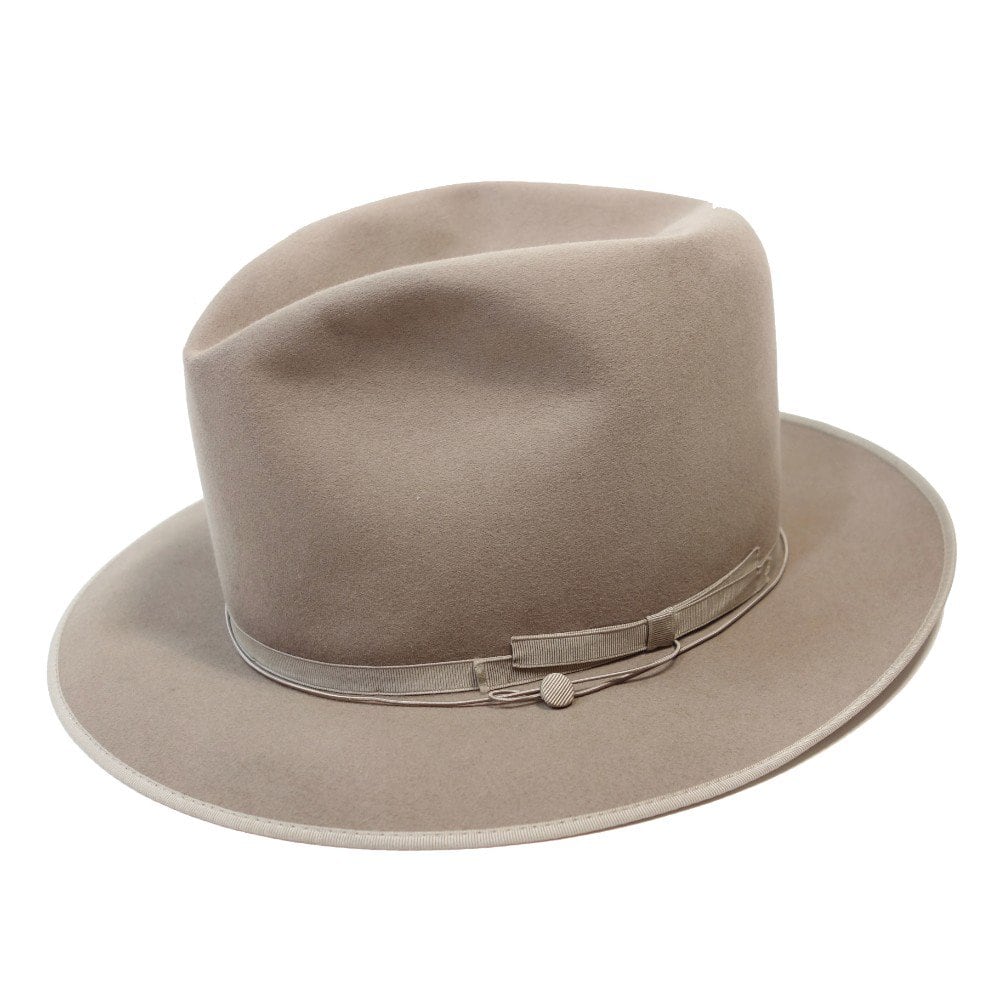 1950s-60s vintage, Borsalino felt hat. A long-established Italian store founded in the 1800s, the quality of felt completed after 7 weeks of time and 50 processes is the reason why it is the king of hats. Felt quality, which is characterized by the soft and fine feel of rabbit fur, is a rare gem that can only be tasted in Vintage, which is different from modern Borsalino. REG US PAT OFF. Engraved Probably designed for the United States, Western-designed diamond crease, long brim specifications. The pale Greige felt is soft and supple, and you can enjoy a taste different from American brands. There is some stretch on the strap. There is a feeling of use over the years, but it is in a beautiful state subjectively. Since it is old, it rarely deteriorates over time. Please understand the characteristics of vintage. Available at the Harajuku store. (The store may move.) Size: 7 1/8 (US) Top height: 10 Brim: 6.5 Inner circumference (head circumference): 57 Inner circumference (vertical): 20.3 Inner circumference (horizontal): 16.5