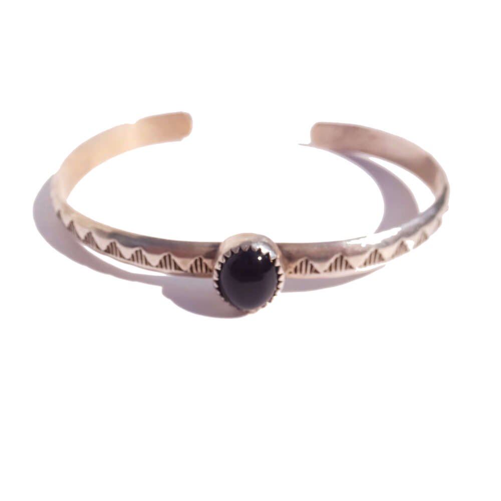 It is a vintage bangle around the 1970s. Not to mention the beautiful decoration, the contrast between the heavy silver and the stone, which is probably onyx, is a deviation. The engraved hallmark of STRELING is HC. It is in good condition subjectively, but the atmosphere is attractive, so please understand the characteristics of vintage before purchasing. MATERIAL silver Length (including opening): 174mm Opening: 25mm Width (maximum value): 12mm