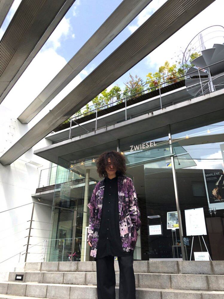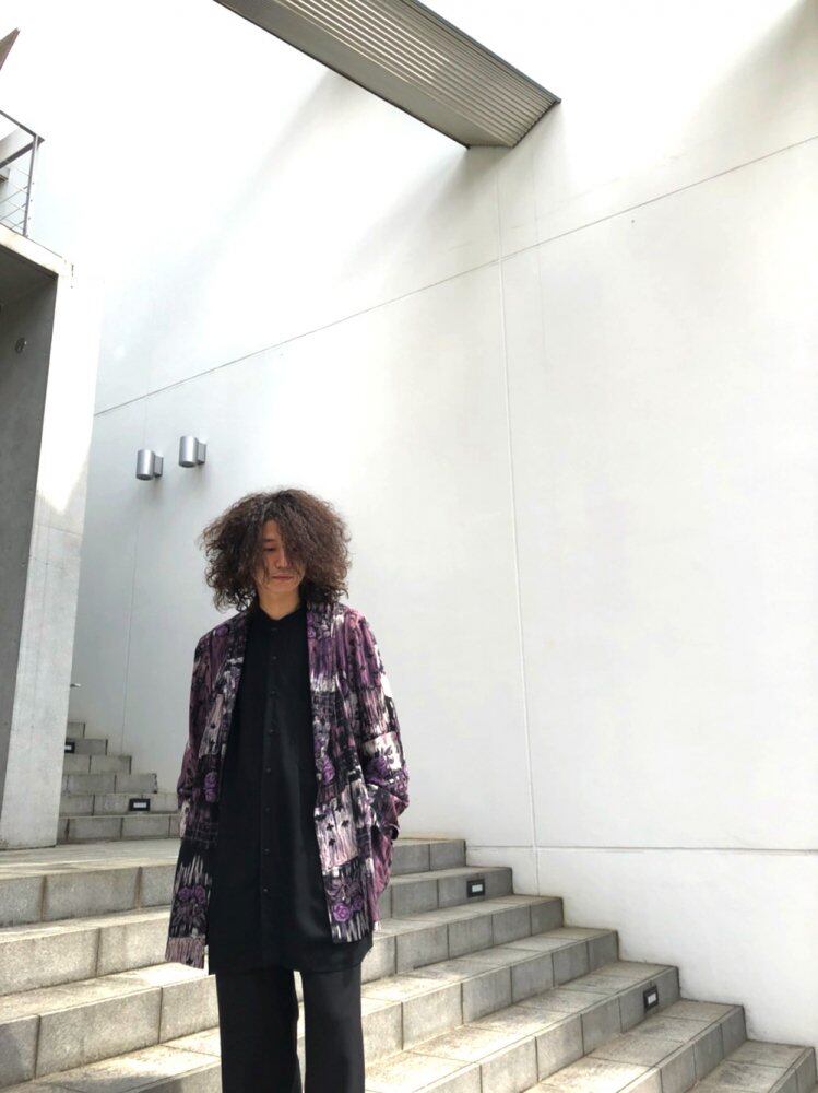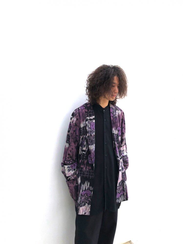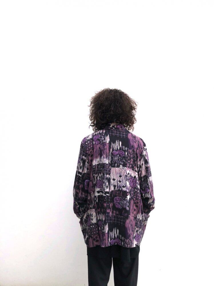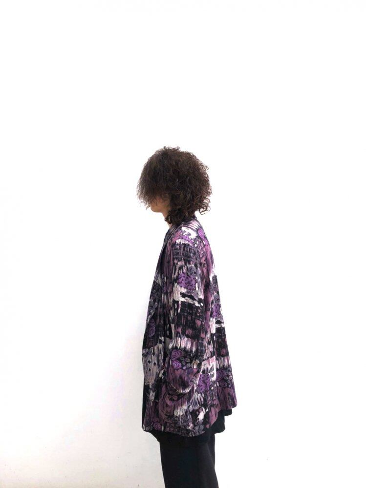 80s light jacket Purple x black botanical pattern with an artistic atmosphere Light and thin 100% rayon fluffy fabric A moderately loose and modern over-silhouette