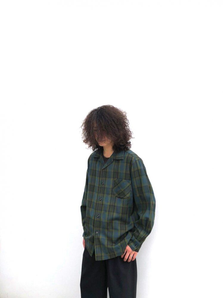 60s open collar shirt A thin, silky summer wool fabric with a bitter color of olive and khaki plaid. A loose silhouette and an oversized vintage shirt.
