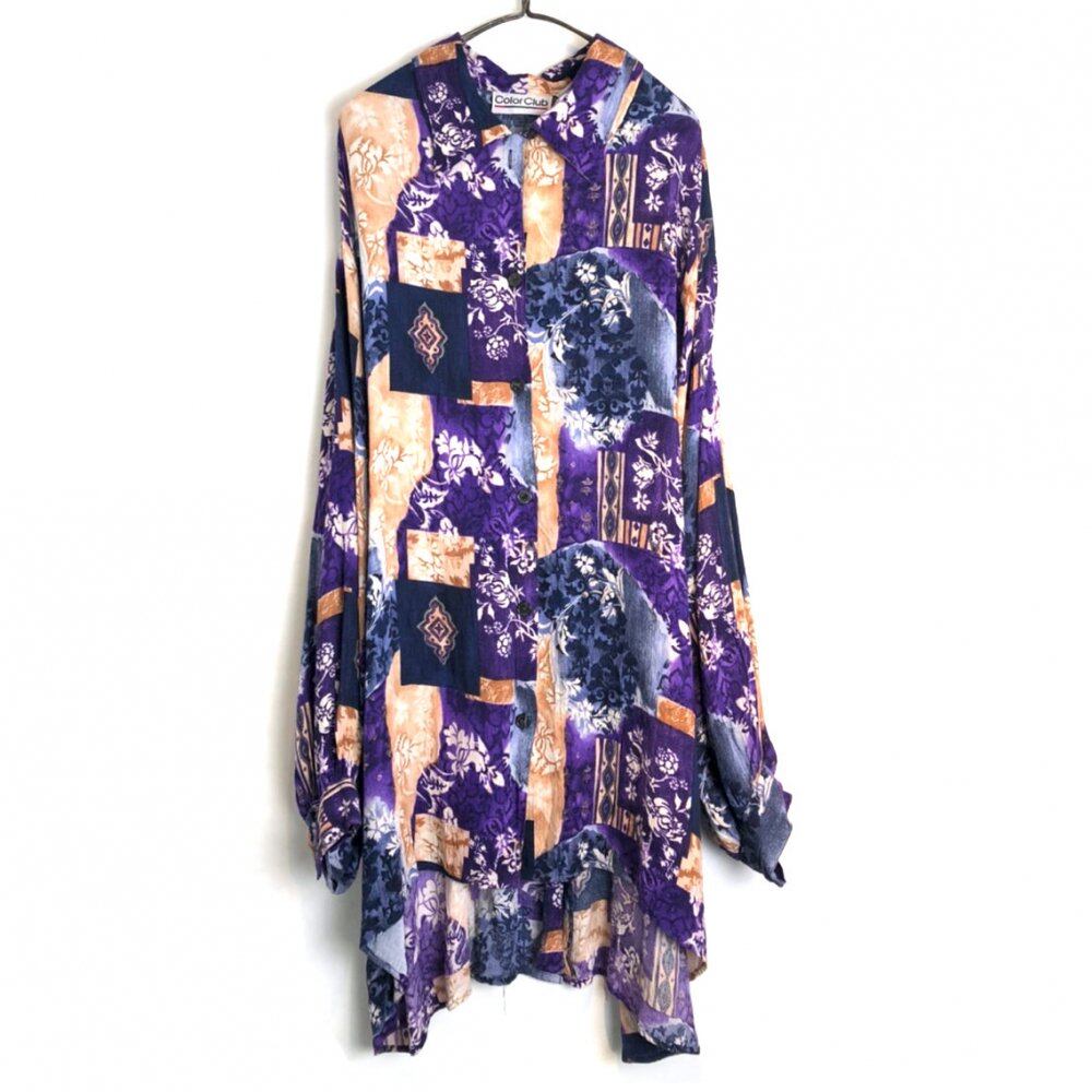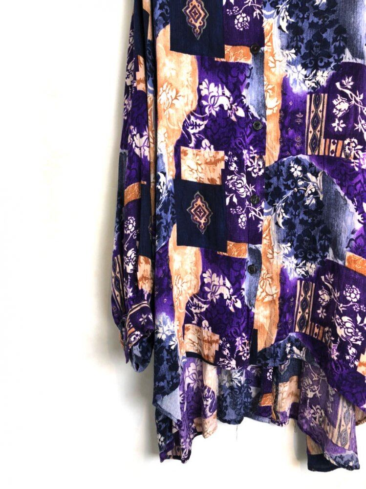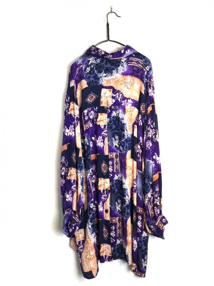 80s long shirt Soft and soft texture of gauze Purple x navy psychedelic atmosphere botanical pattern Loose and relaxed long silhouette One piece that stimulates spring outfits