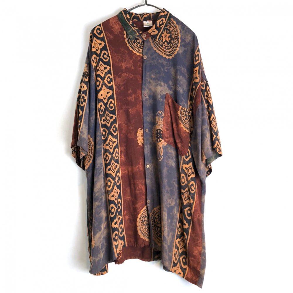 80s short sleeve rayon shirt Brown, black, mustard irregular pattern switching is interesting One piece Good silhouette with plenty of space