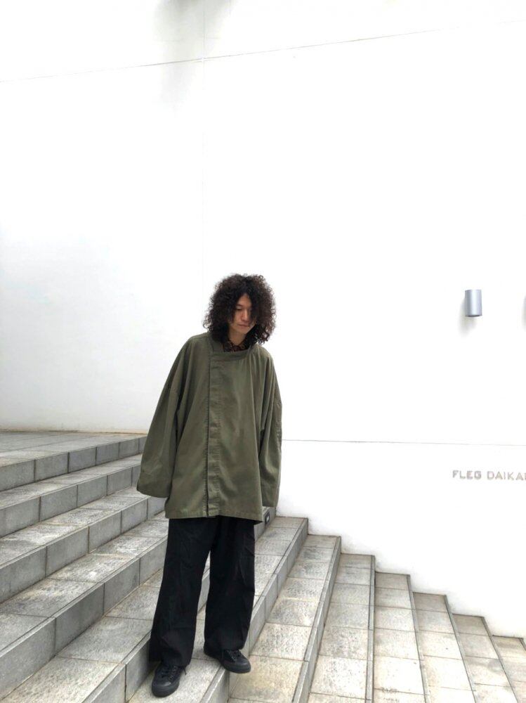 90s big silhouette shirt The loose and voluminous big silhouette looks like a poncho. The fabric is cotton x polyester and the soft texture is a military-like olive color.