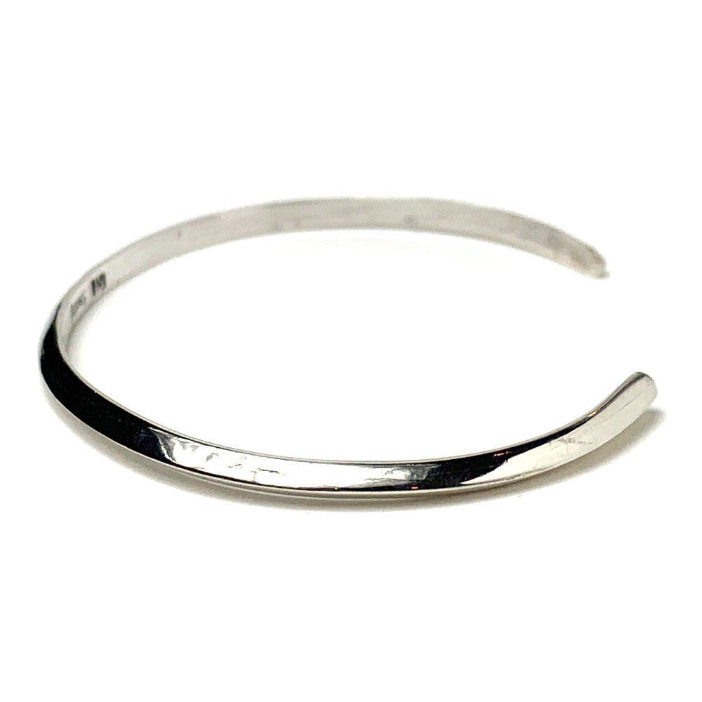 A plain type triangle silver bangle by Navajo female artist ERICKA NICOLAS BEGAY. All of her works use handmade ingot silver, giving off a presence that sets it apart from modern machine-produced Navajo jewelry, and because the plate making is also particular about handmade, there is no one that is the same. Each item is unique and unique. Inspired by the Fred Harvey style that has been around since the 1800s, her work is different from the heavy and profound Navajo jewelery, with a delicate and delicate atmosphere and a stylish yet handmade texture. This triangle type has a stylish atmosphere with a narrow silhouette and edgy edges. It has a mannish and delicate look that can be recommended not only for layering but also for women. There is no dullness due to oils and chemicals that are common in machine production, and you can feel the elegant and beautiful shine unique to handmade products, and the careful finish has the delicacy unique to women. We try to make the product photos as close to the actual colors as possible, but the colors may differ from the actual products depending on your monitor settings, room lighting, etc.