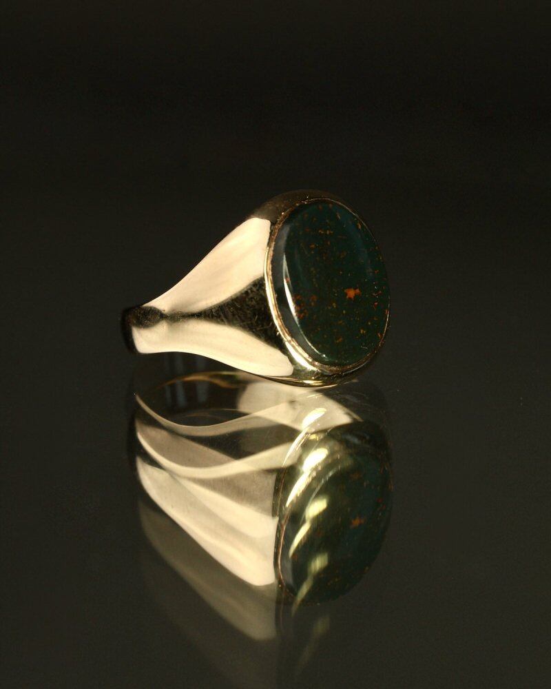Signet ring made in England. It is the only ring that is allowed to be worn among British gentlemen who wear good things that can be used for a long time with as little waste as possible. The so-called blood stone top that when Jesus Christ was crucified, fresh blood turned from a wound to a green earth or a stone. It is said to bring spiritual energy from its holiness and has a healing effect. Dark green with well-red spots and a deep color. A very simple design with a gold body that draws a soft curve and a top only. It is a designless solid ring that is hard to find when you look for it. Engraved 375-9ct gold, Hallmark of the 1968 London office. Please check the condition in the photo and purchase after acknowledging the characteristics of vinteg.