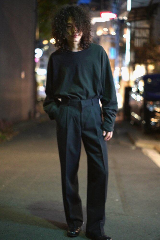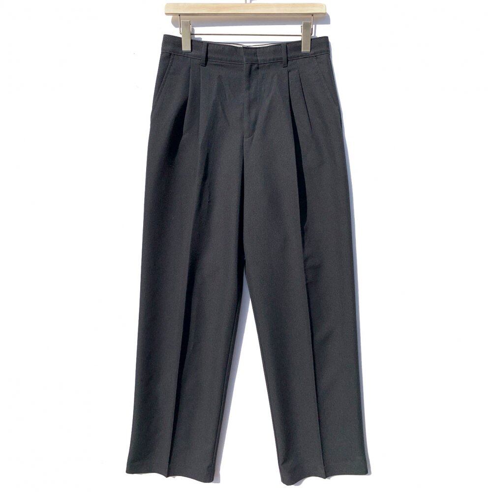 It has a mature silhouette with 2 tuck and a taper toward the hem while having a space around the waist.