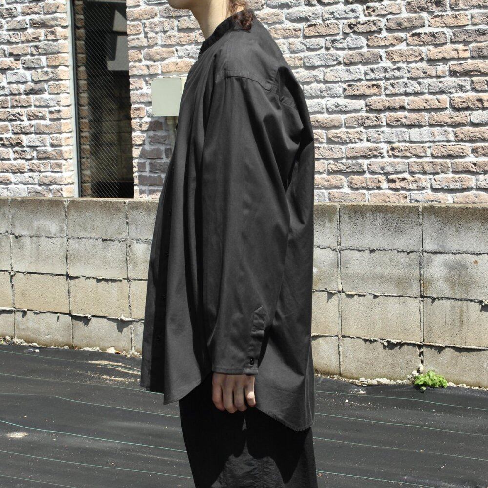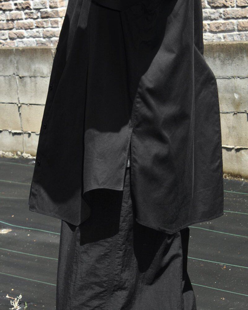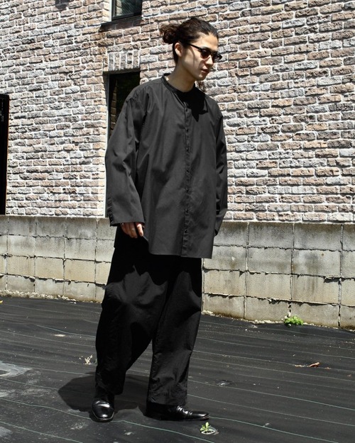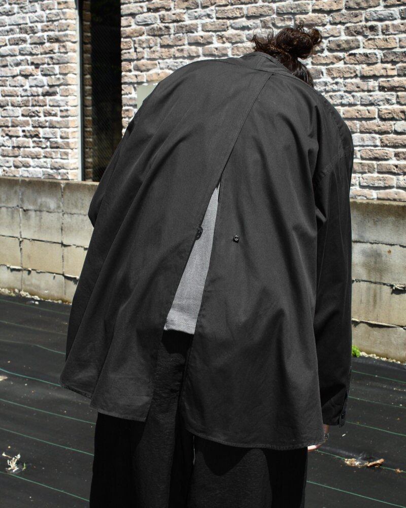 Our original pimpstick remake line dress shirt. A formal shirt made of cotton / polyester fabric that has both softness and firmness is remade on the body. An all-black color with a calm look while showing a solid feel. The collar is removed together with the collar to give a clean impression around the neck, and the cuffs are eliminated to make a difference in the side seams to create a sense of omission and eliminate the stiff impression of formal shirts. A straight slit is provided from under the back yoke for a lighter impression. It is a utility item that can be worn as a haori like a cardigan. We have calculated a relaxed silhouette and dared to choose a body with a big silhouette. There is one scratch on the back body. Since we are remaking old clothes, there are rare cases of deterioration over time. Please check the photo and understand the characteristics of Vintage before purchasing.