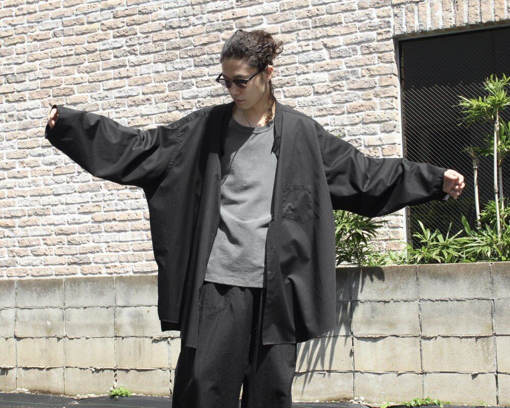 Our original pimpstick remake line dress shirt. A formal shirt made of cotton / polyester fabric that has both softness and firmness is remade on the body. An all-black color with a calm look while showing a solid feel. The collar is removed together with the collar to give a clean impression around the neck, and the sleeve length is shortened and the cuffs are moved in consideration of the overall balance. By making a difference in the side seams, a feeling of omission is created and the formal shirts stiff impression is eliminated. It is a utility item that can be worn as a haori like a cardigan. We have calculated a relaxed silhouette and dared to choose a body with a big silhouette. Since we are remaking old clothes, there are rare cases of deterioration over time. Please check the photo and understand the characteristics of Vintage before purchasing.