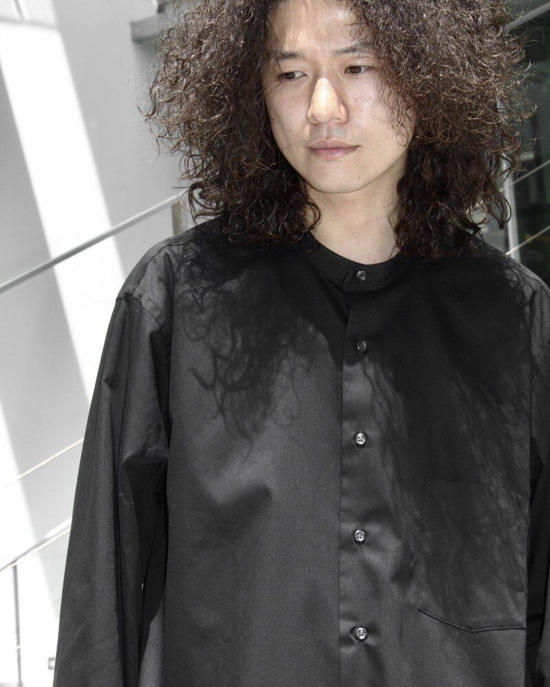 Our original pimpstick remake line dress shirt. A formal shirt made of cotton / polyester fabric that has both softness and firmness is remade on the body. An all-black color with a calm look while showing a solid feel. The collar is removed and the collar is made thinner to give a neat impression around the neck. Considering the overall balance, the sleeve length is shortened and the cuffs are removed to create a silhouette like a wide sleeve. By making a difference in the side seams, a feeling of omission is created and the formal shirts stiff impression is eliminated. It is a utility item that can be worn as a haori like a cardigan. We have calculated a relaxed silhouette and dared to choose a body with a big silhouette. Since we are remaking old clothes, there are rare cases of deterioration over time. Please check the photo and understand the characteristics of Vintage before purchasing.