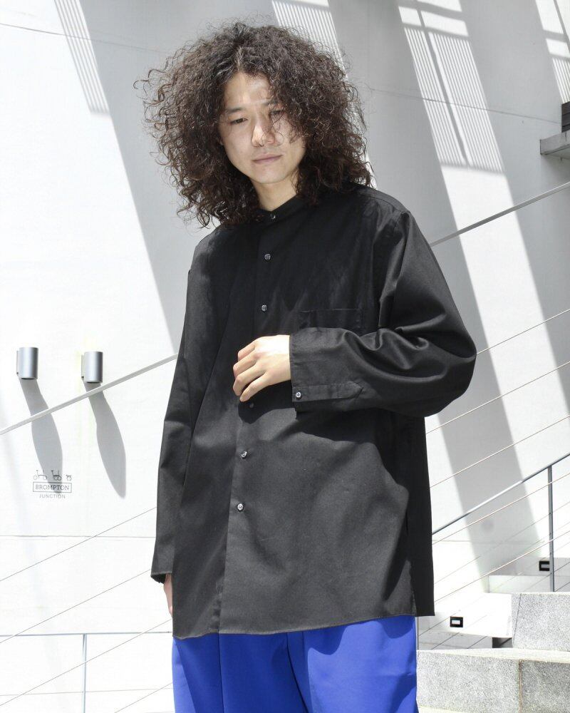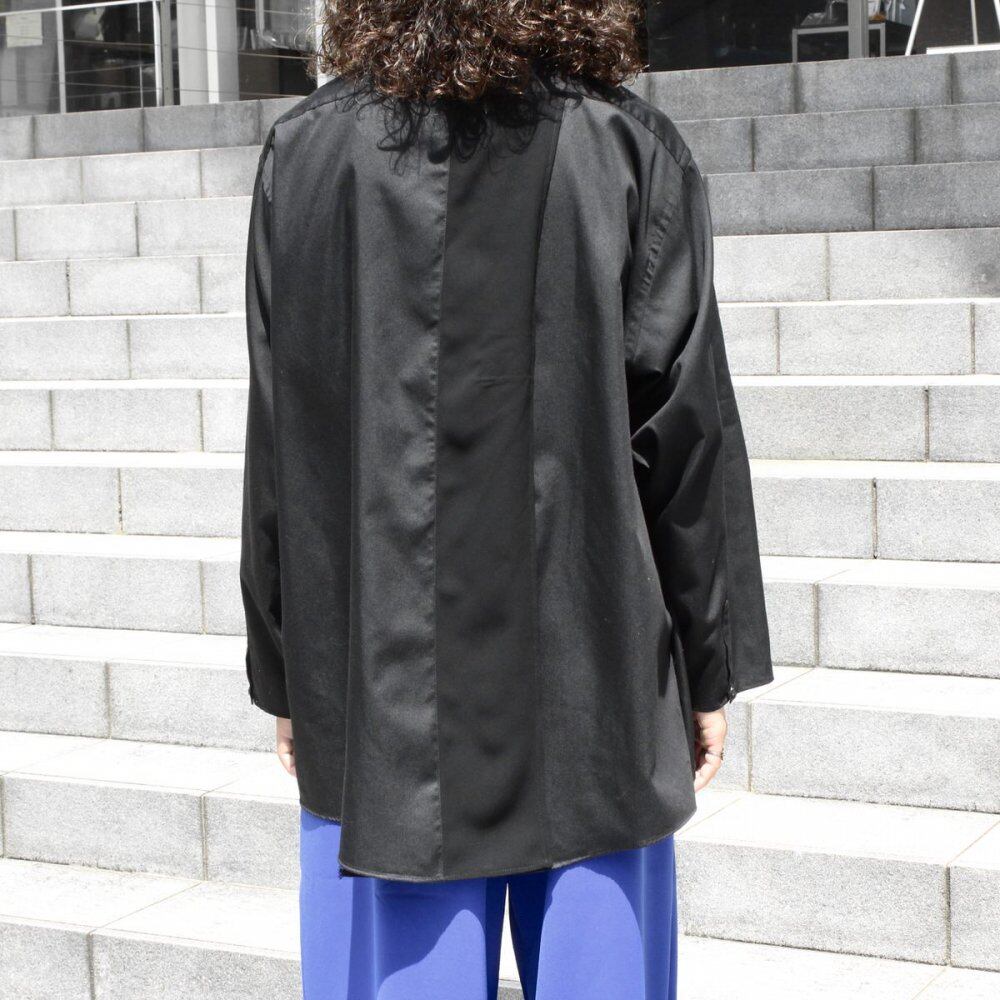 Our original pimpstick remake line dress shirt. A formal shirt made of cotton / polyester fabric that has both softness and firmness is remade on the body. An all-black color with a calm look while showing a solid feel. The collar is removed and the collar is made thinner to give a neat impression around the neck. Considering the overall balance, the sleeve length is shortened and the cuffs are removed to create a silhouette like a wide sleeve. A straight slit is provided from under the back yoke, and another crepe fabric is added to create a feeling of slipperiness and make it flutter in the wind. It is a utility item that can be worn as a haori like a cardigan. We have calculated a relaxed silhouette and dared to choose a body with a big silhouette. Since we are remaking old clothes, there are rare cases of deterioration over time. Please check the photo and understand the characteristics of Vintage before purchasing.