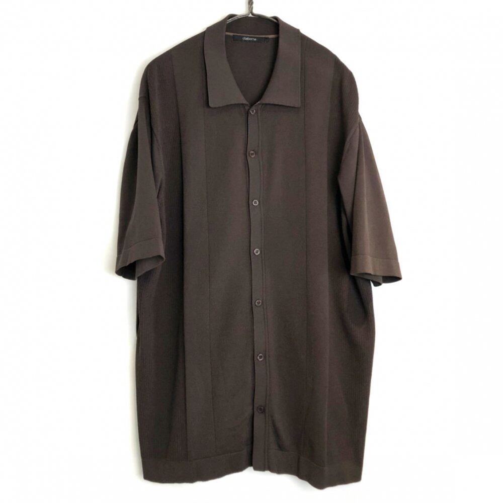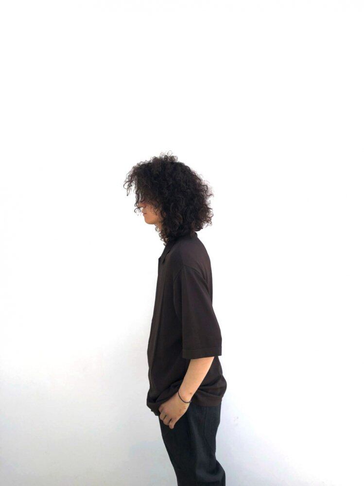 A knit shirt made of 100% polyester with a stretchy feel that feels smooth to the touch. A simple design like a polo shirt with a stylish knitted fabric. Brown color with an adult-like and calm atmosphere.