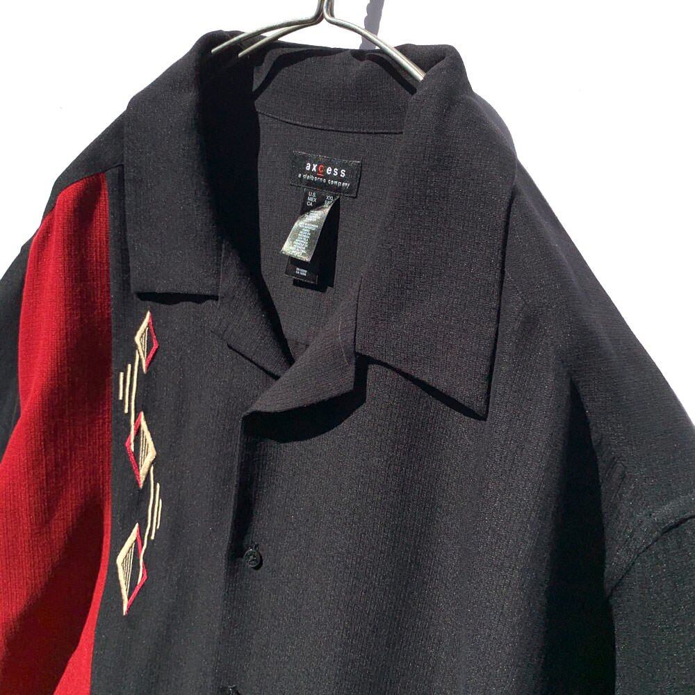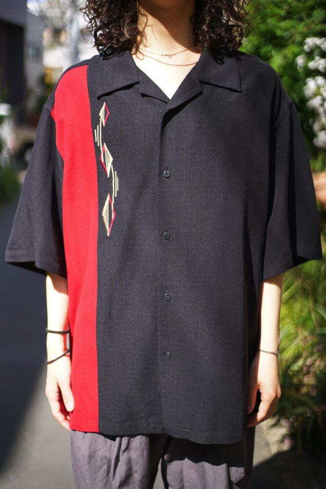 The black body is asymmetrically switched with a red color co-fabric, and the design is embroidered with embroidery on the chest.