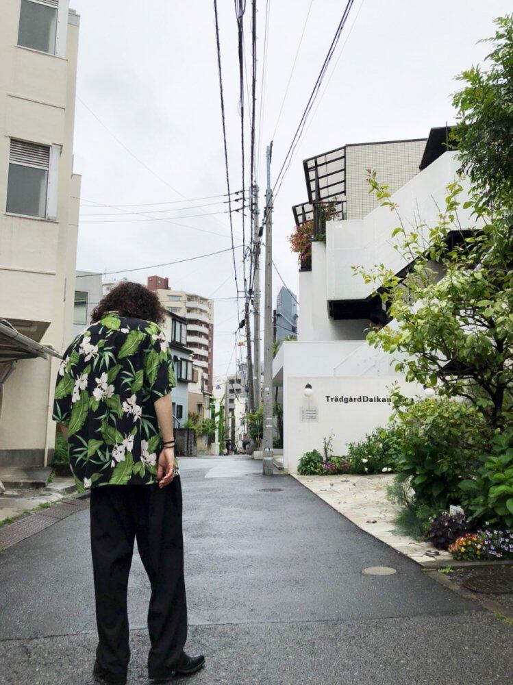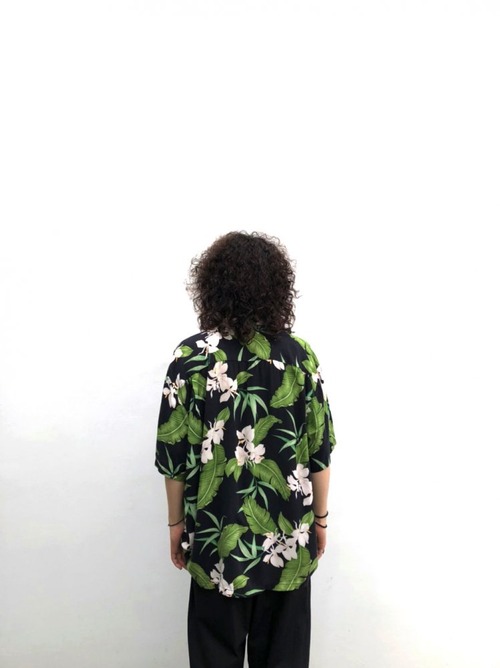 Aloha shirt from the 80s Black color with green and white botanical pattern shines vividly.