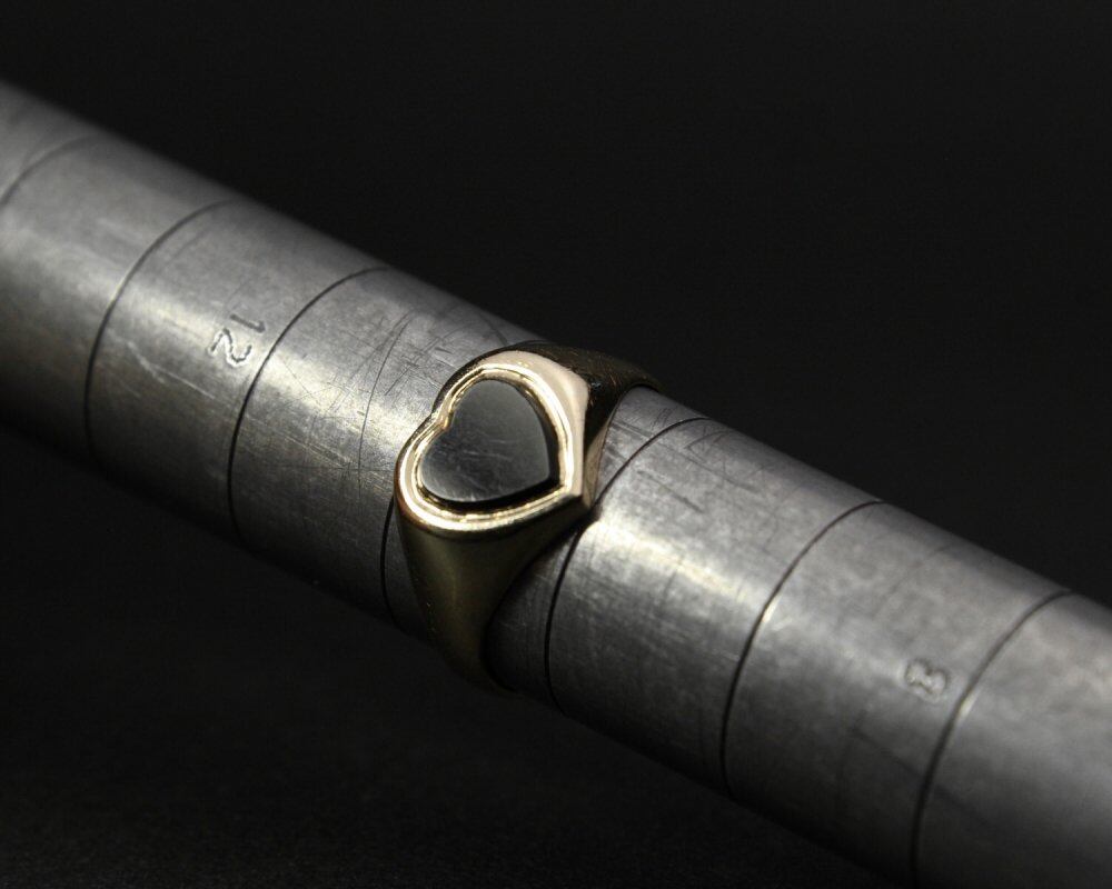 Signet ring made in England. It is the only ring that is allowed to be worn among British gentlemen who wear good things that can be used for a long time with as little waste as possible. It is a heart motif that can be seen in baby rings, eternity rings, claddagh rings, etc., but this is a very rare specification with onyx in the center. The silhouette is also a simple signet ring type and it seems that both men and women can wear it. 375-9ct Gold, Hallmark in Birmingham office. Ring case is not included. Please check the condition in the photo and purchase after acknowledging the characteristics of vinteg.
