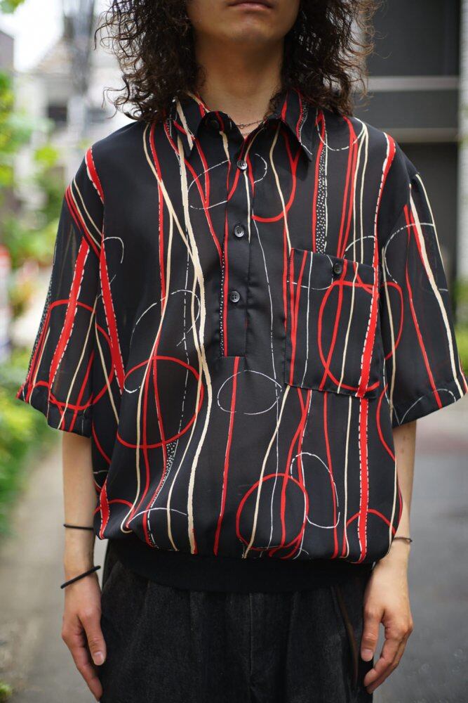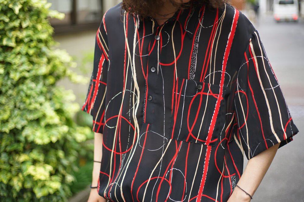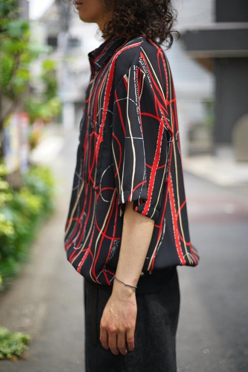 The light texture of polyester fabric is used, and the contrast of the abstract red and white lines on the black body gives a modern impression.