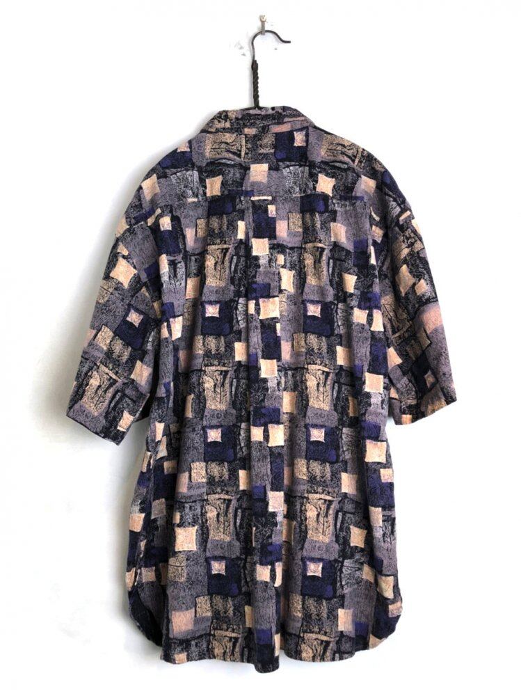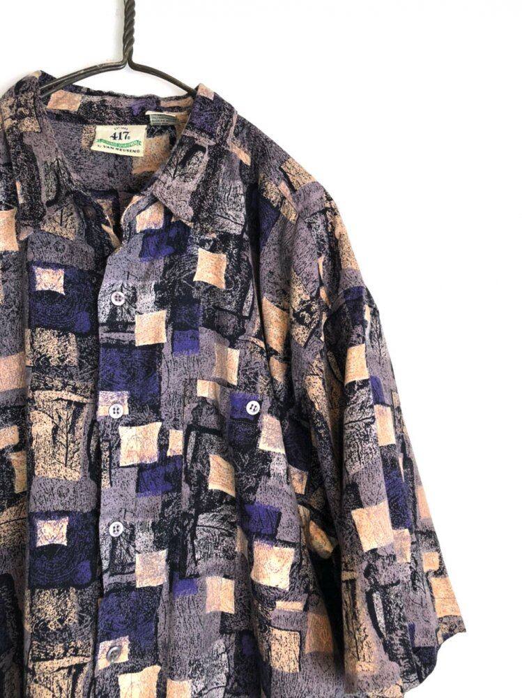 80s short-sleeved shirt One piece of cotton and rayon that is geometrically studded with intricate shades of gray, beige, and purple.