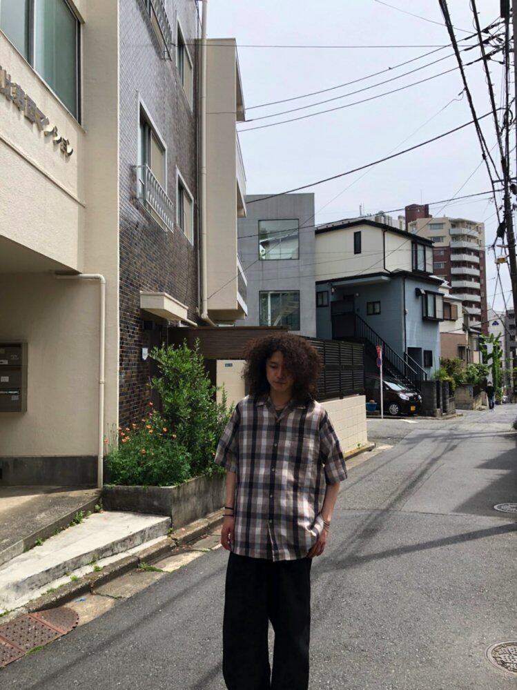 90s short-sleeved shirt Beige x black with a calm atmosphere and a soft-colored plaid cotton x polyester light and smooth fabric.