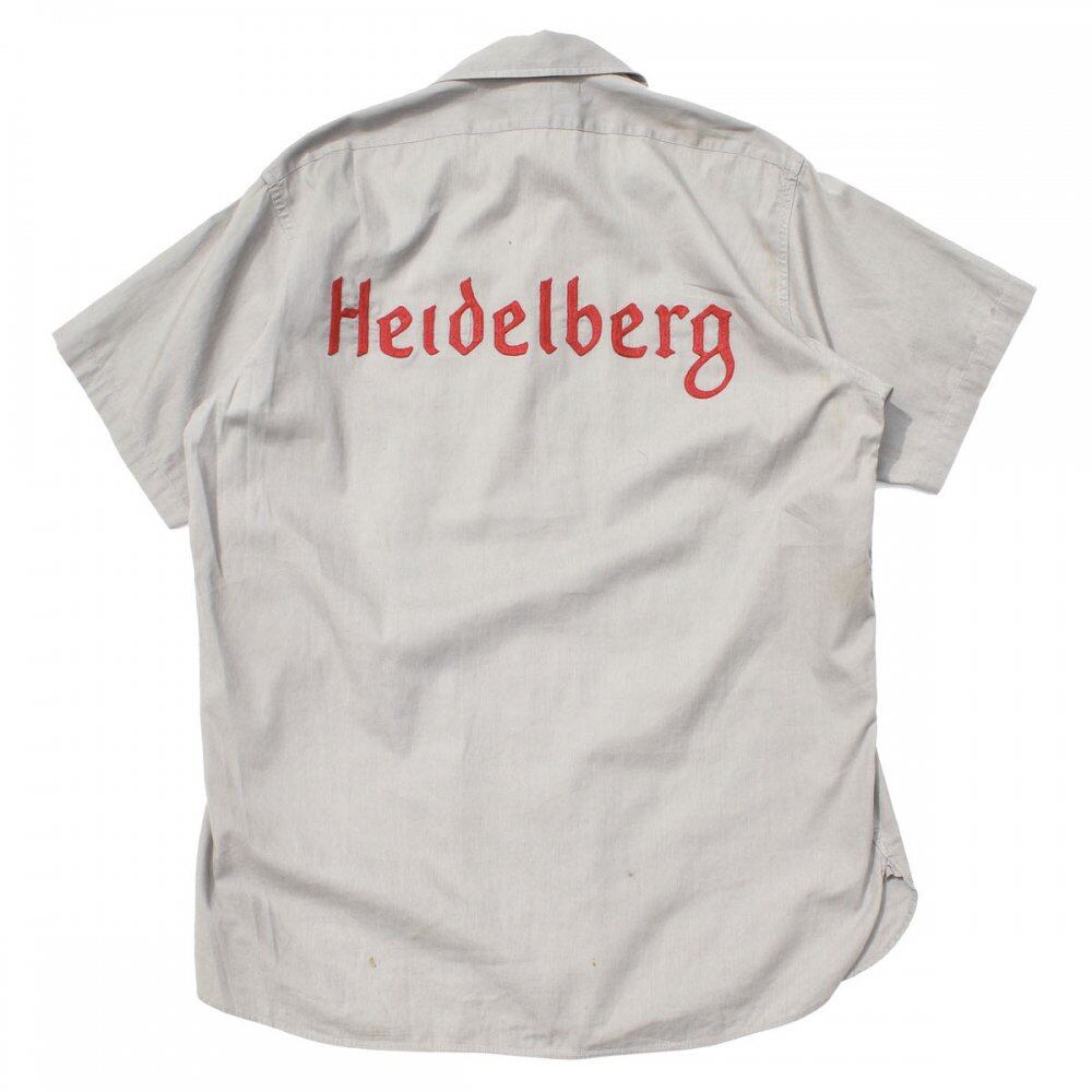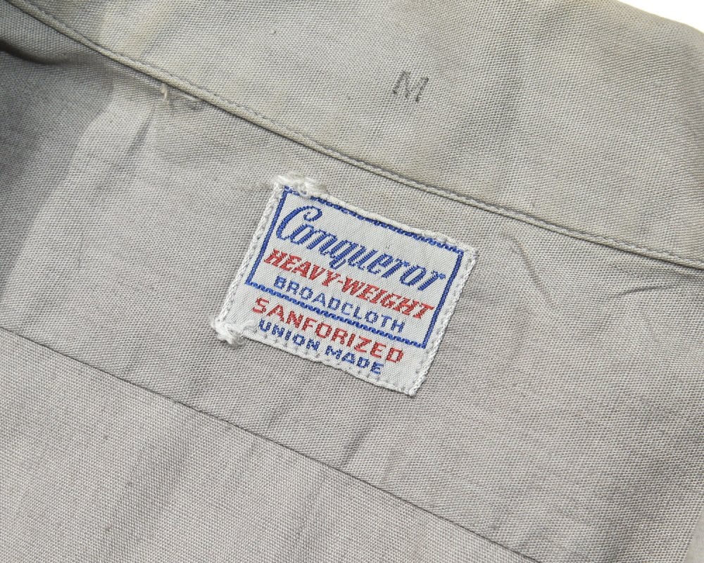 Conqueror work shirt from the 1950s. From the chain stitch on the back, it seems to be the uniform of the US branch of Heidelberg, a printing equipment manufacturer headquartered in Germany. The precious work shirt of this age, light gray cotton broadcloth has a light texture. Mannish and astringent vintage. Although it is M size, it has a clean silhouette with a moderate amount of space. It is not so noticeable, but it is in good condition from the viewpoint of light stains and discoloration in some places. Since it is an old product, it rarely deteriorates over time. Please check the photo and purchase after acknowledging the characteristics of vintage.