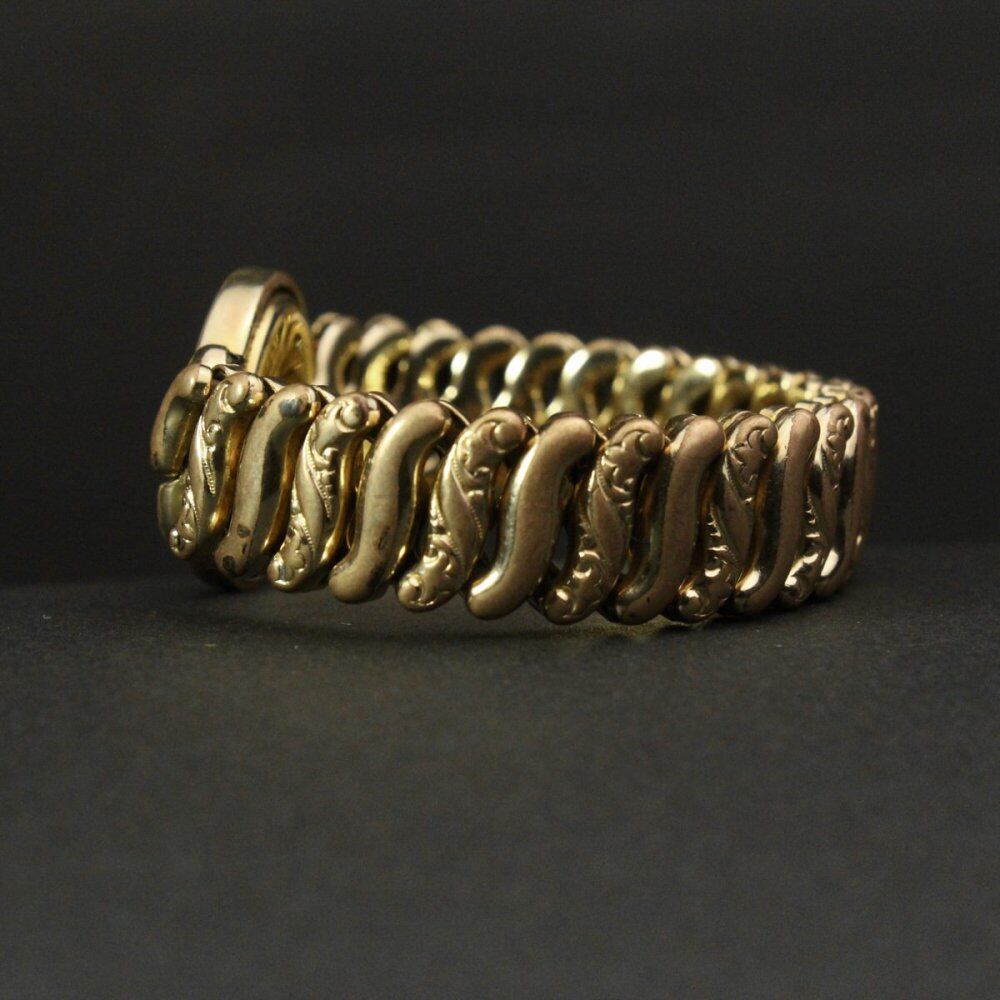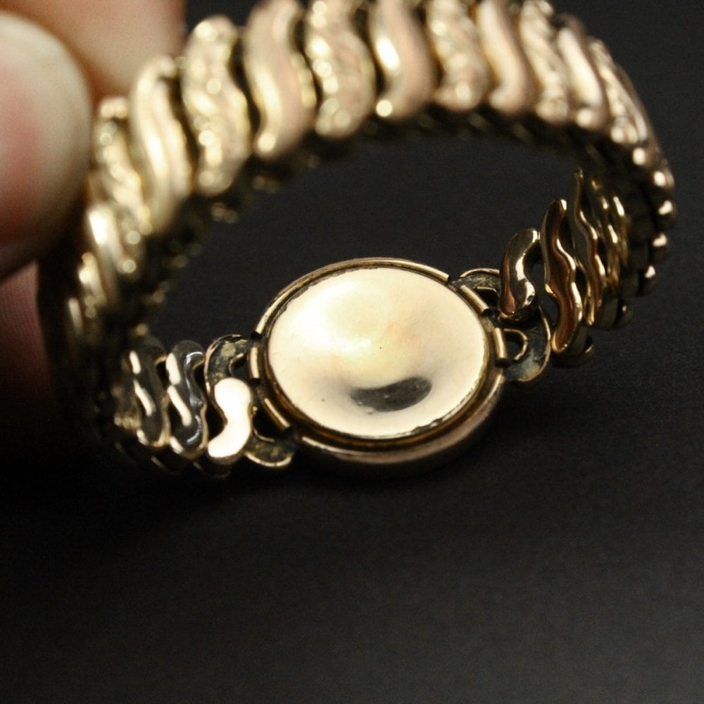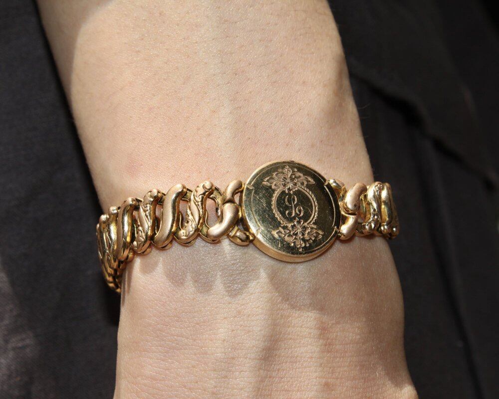 This item was presented by couples during the war from the early 1900s to World War II. The elastic bellows bracelet, which is no longer made, has a proper fit and is thickly gold-plated, and its beautiful and delicate structure creates a vintage-like profound feeling and luxurious atmosphere. This is a model with the name of AMERICAN QUEEN made by the well-established PITMAN & KEELER company founded in 1893. There are many heart-shaped (sweet heart) tops, but this is a signet type with clock-shaped round top initials and is an antique one. It is in good condition subjectively. Since it is old, it may be dull over time and have minor scratches. Please check the photo and understand the characteristics of vintage before purchasing.